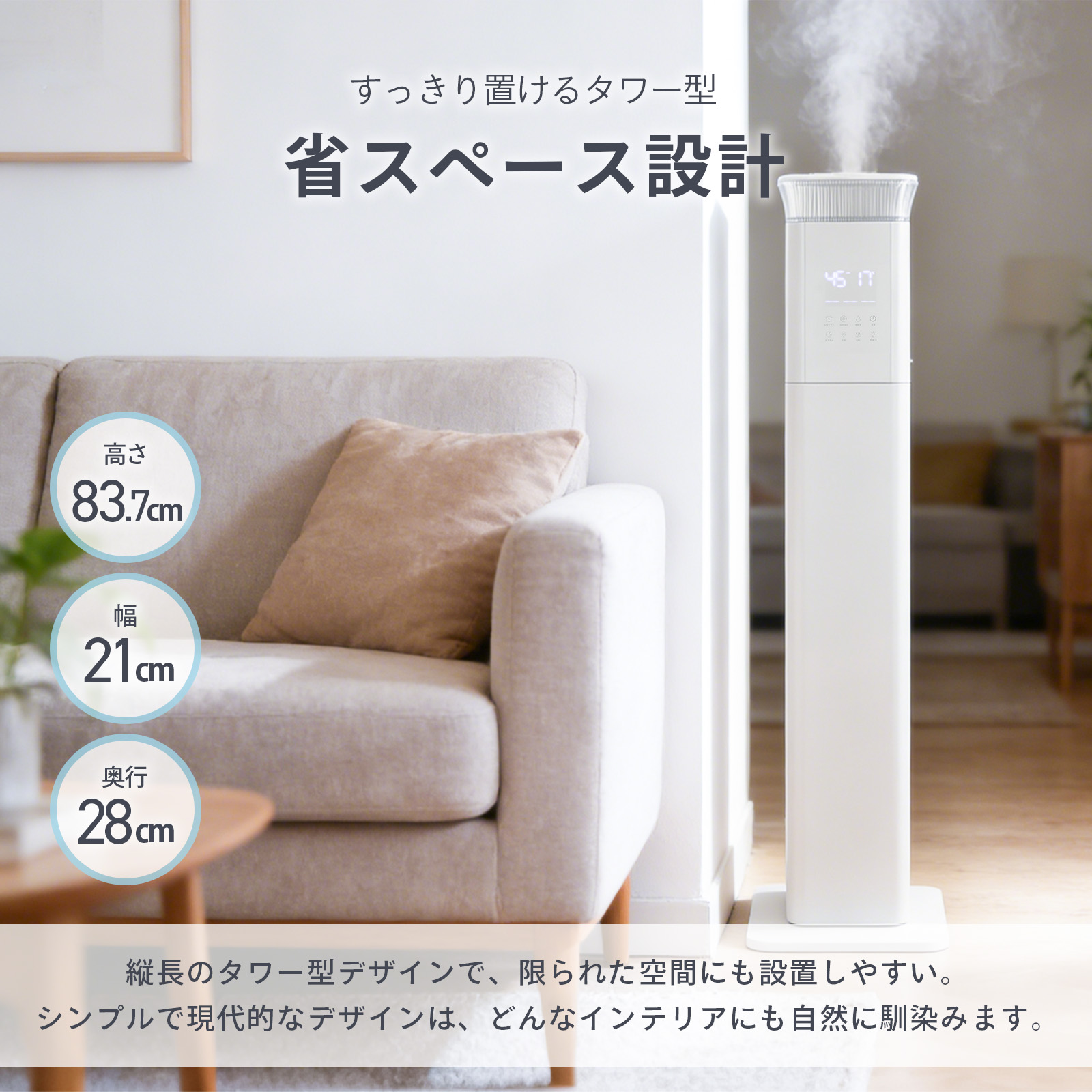 乾燥対策も清潔さも妥協しないタワー型加湿器。