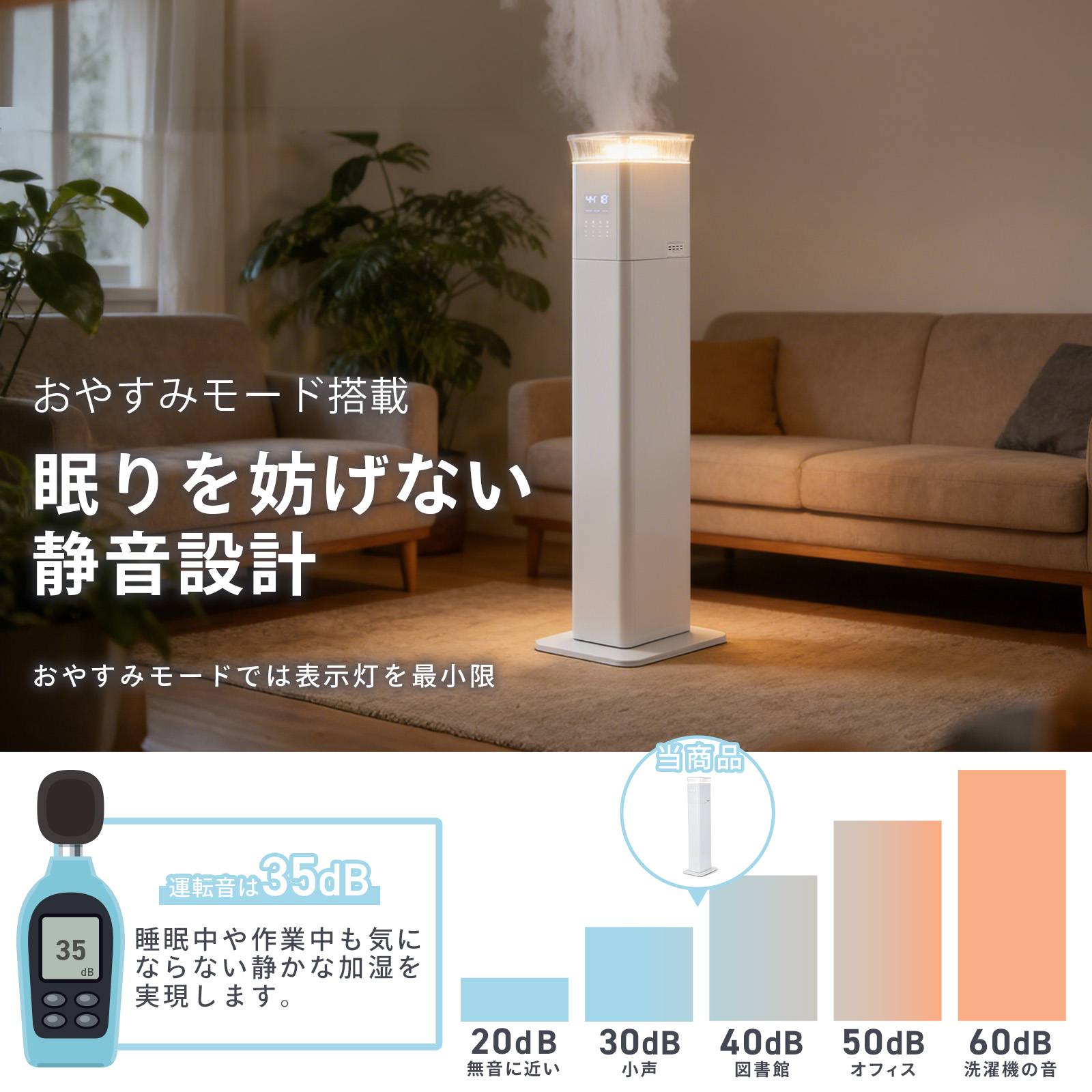 稼働音は約35dBの静音設計だから、寝室や仕事中でも気になりません。