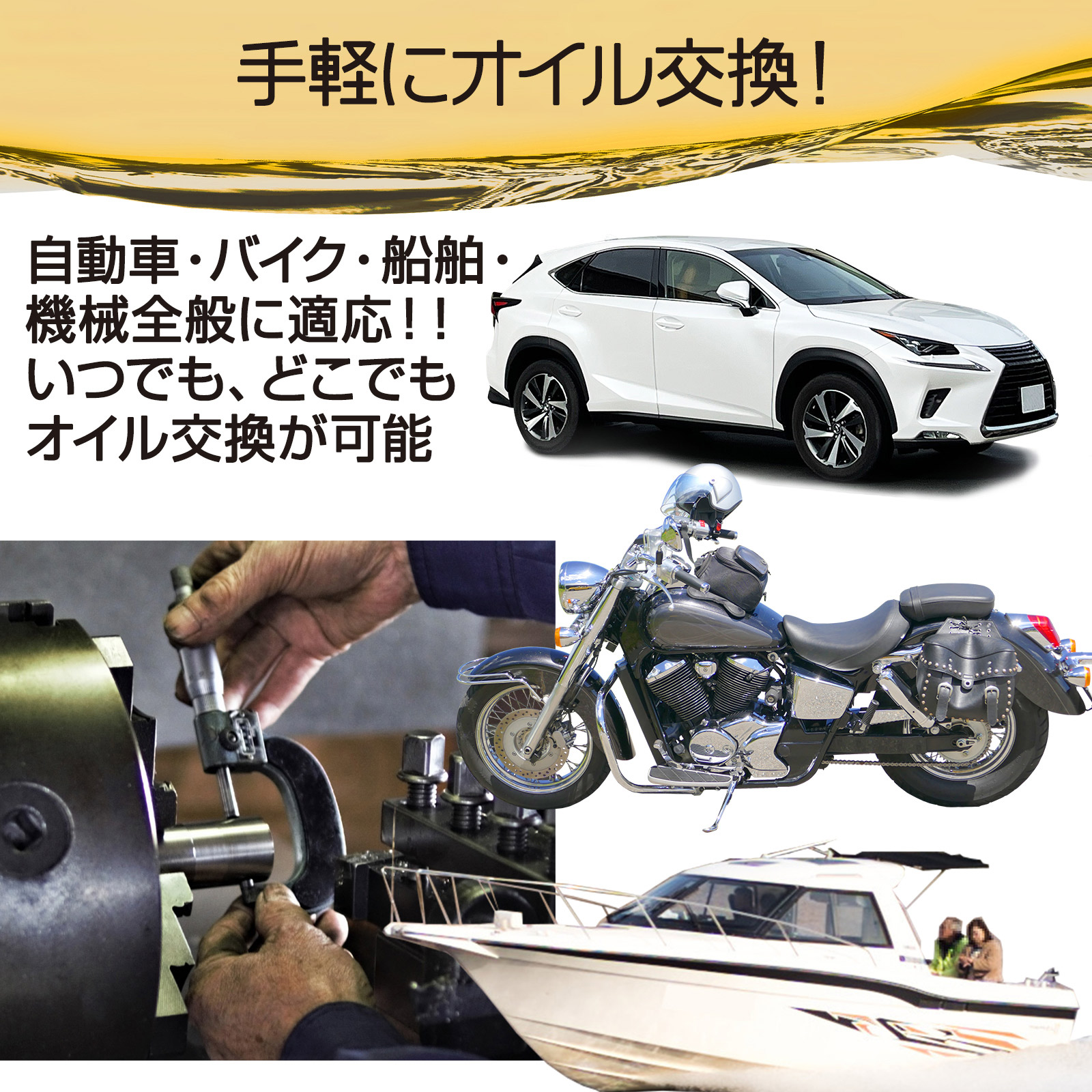 車だけではなく、オートバイ・4サイクル船舶機・耕運機・フォークリフトなど潤滑油の交換に威力を発揮します。