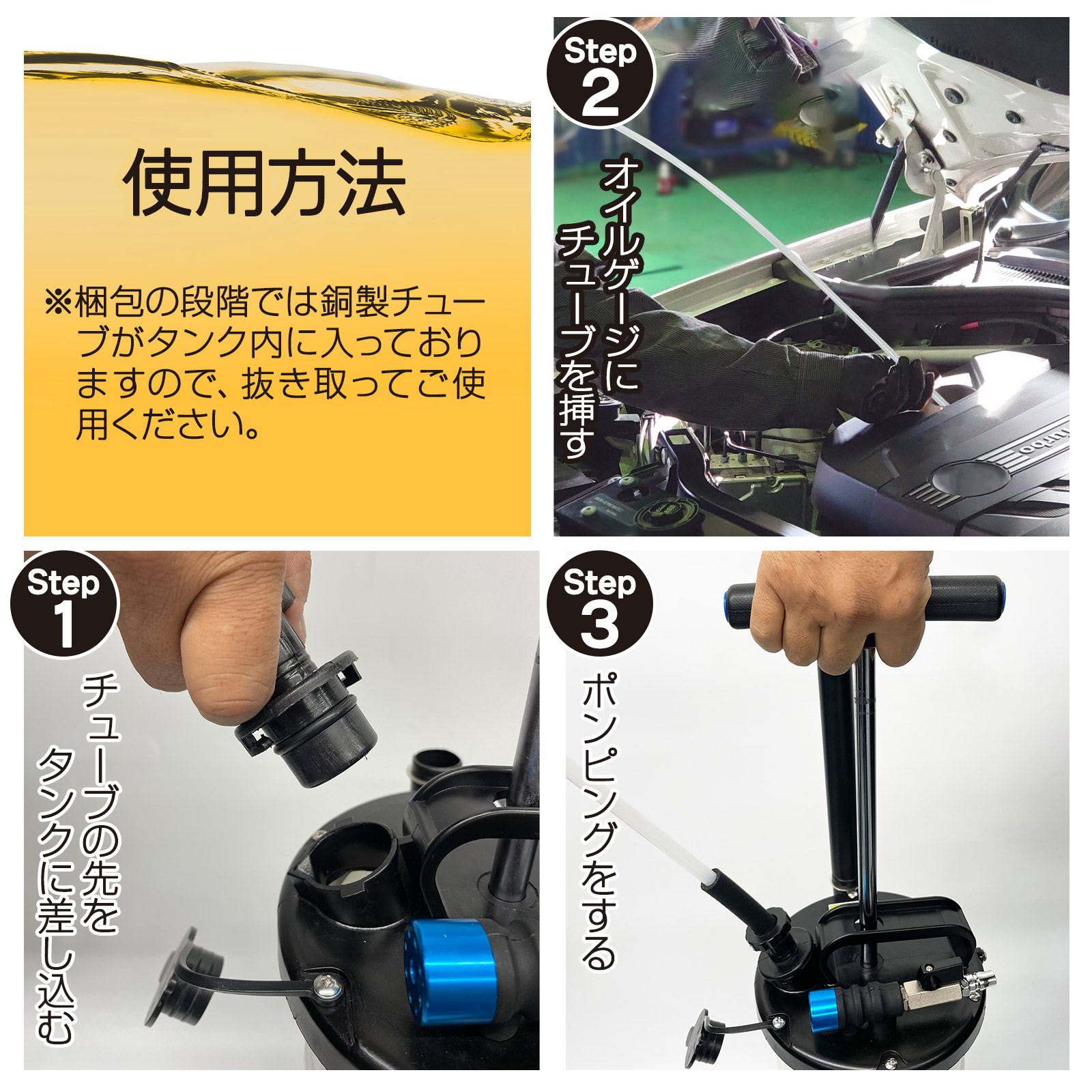 チューブを挿して数回ポンピングするだけで、後は勝手にオイルを吸い上げてくれるので、