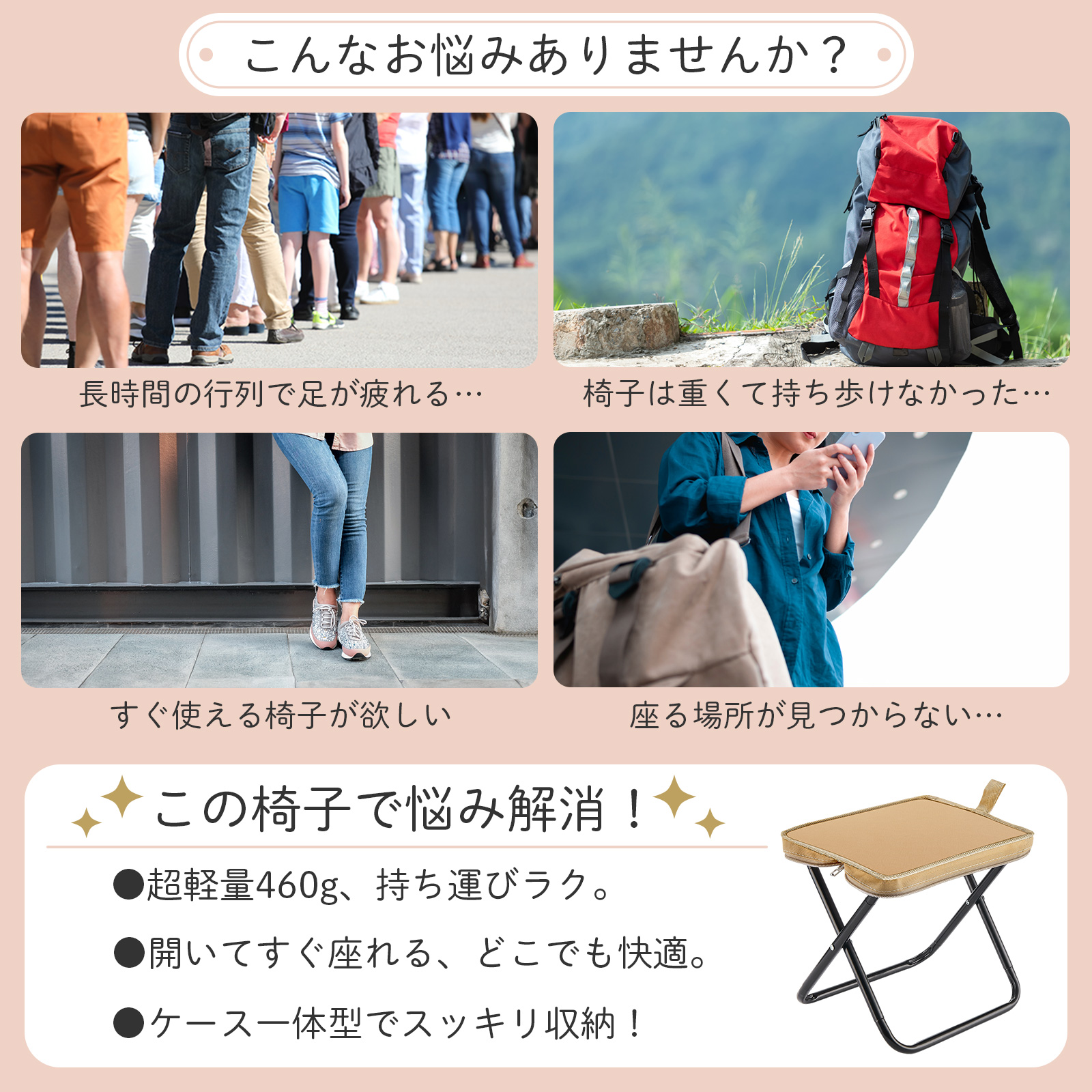 大きな椅子は重くて持ち歩けない…。そんな悩みを解決するのが、このコンパクト折りたたみ椅子。
