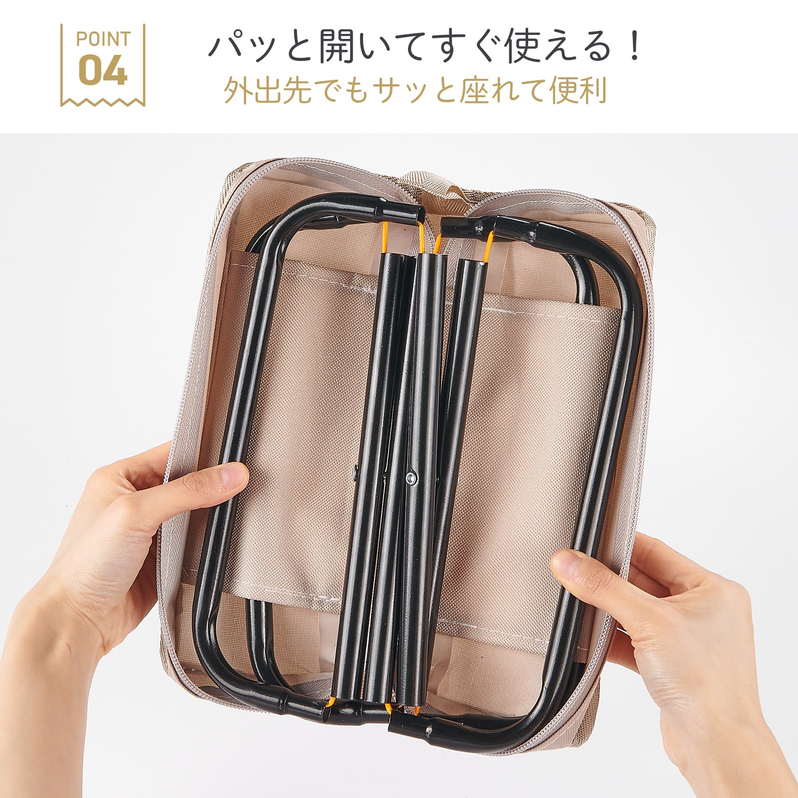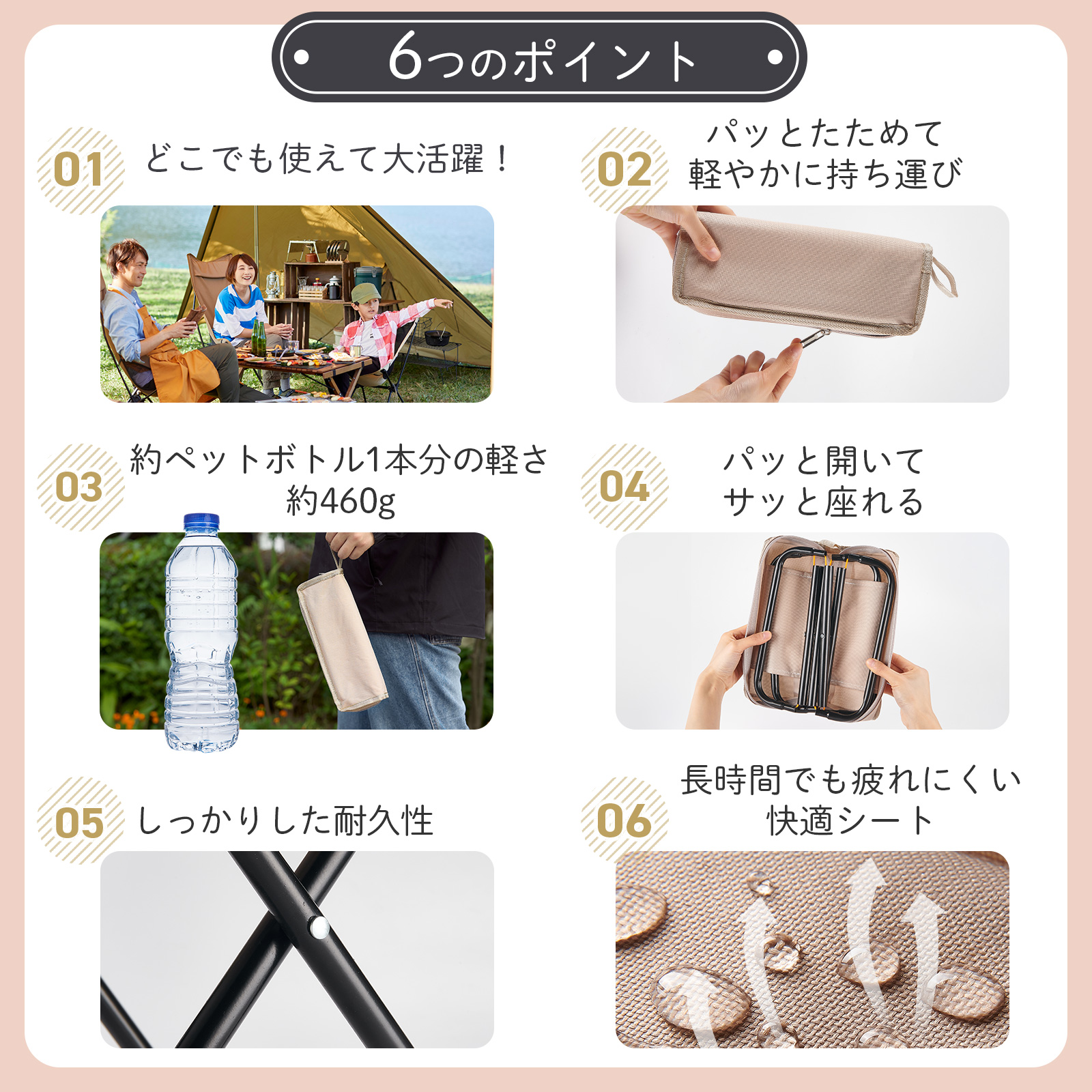パッと開いてすぐ座れ、ケース一体型でスッキリ収納。思い立ったらすぐ使えて便利です。