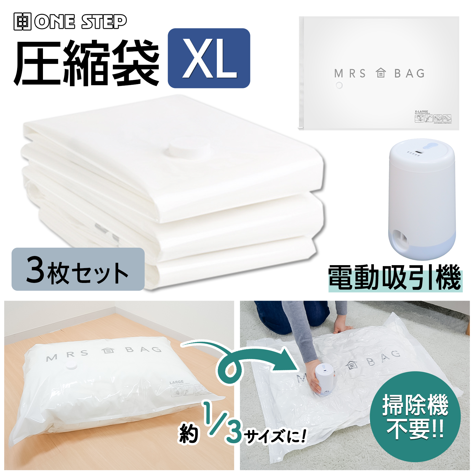 圧縮袋 衣類 ふとん 電動ポンプ 吸引機 バルブ式 布団圧縮袋 ポンプ 電動 掃除機不要 超特大 3枚セット