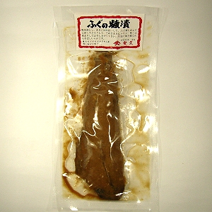 【ふぐ】 ふぐにはテトロドトキシンという猛毒があり、ふぐ調理免許を持った人でないとふぐをさばくことができません。 「ふぐ」と言っても100種類以上のふぐがありますが、すべてのふぐに毒があるわけではありません。またふぐの毒性・毒力は、ふぐの種類やその部位、また季節や漁獲海域によっても大きく異なるので、調理は専門の資格を持った人に任せ、素人は手を出さないことが大事です。 無毒のふぐもありますが、真子(まこ)とよばれる卵巣や肝臓などの内蔵は、ふぐの種類にかかわらず毒性が強いとされています。ふぐ毒は青酸カリの約1,000倍に匹敵すると言われ、1gの臓器で5,000匹のマウスを殺す毒力です。 ふぐ料理といえばてっさ(ふぐ刺し)・てっちり(ふぐ鍋)などが有名ですが、石川県ではふぐと言えば「ふぐの糠漬け・粕漬け」です。中でも「ふぐの子糠漬け・粕漬け」は、猛毒のゴマフグの卵巣を調理したもので、石川県でしか製造・販売が許可されておりません。 まず、フグの卵巣を半年間塩漬け(塩蔵)にします。この間に毒が抜け、身が締まります。その後、糠に漬けてさらに1年、微生物の働きにより毒を分解させるのだそうです。その後、検査を経て出荷されます。 「ふぐ糠漬け」に使われているのは「クロサバフグ」。近海で獲れるクロサバフグは無毒とされています。(卵巣や肝臓には毒があります。) |