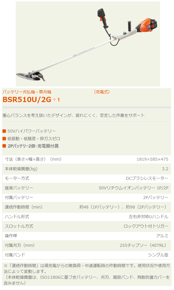 【連続作動時間(min)】約48(1Pバッテリー)、約98(2Pバッテリー)