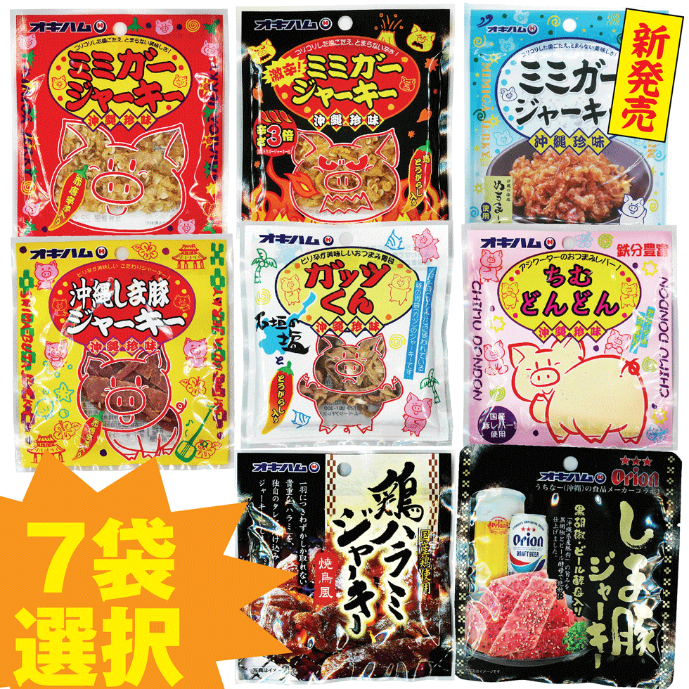 1.ミミガージャーキー 2.激辛ミミガージャーキー 3.ぬちマースミミガージャーキー 5.ガッツくん 6.ちむどんどん 7.沖縄しま豚ジャーキー 8.鶏ハラミジャーキー 9.Orionしま豚ジャーキー から選択7袋セット ビールのおつまみ