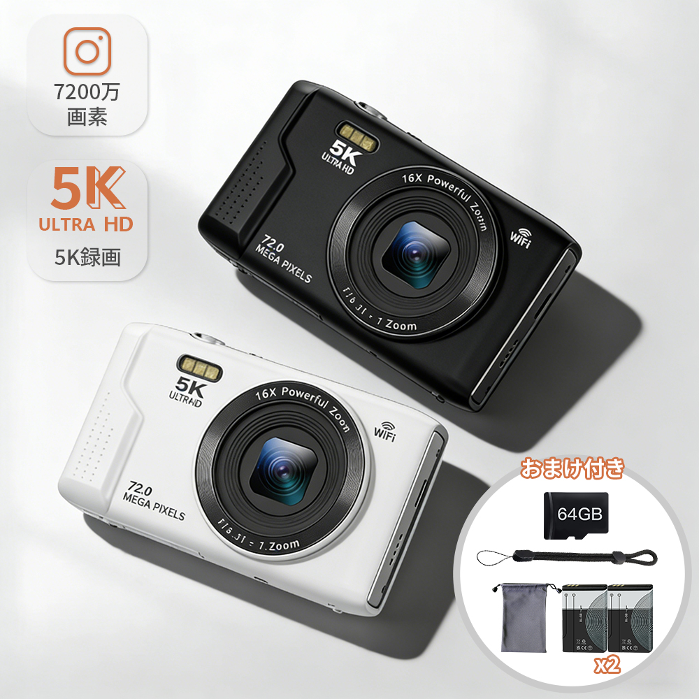 デジタルカメラ カメラ WIFI対応 7200万画素 コンデジ 5K 日本製チップ デュアルレンズ 64GBマイクロSDカード 16倍ズーム オートフォーカス機能 バッテリー2枚