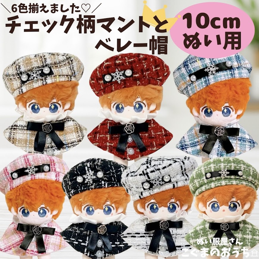 チェック柄マントと帽子セットのお洋服 ベレー帽 ぬいぐるみ用着ぐるみ 推し活 ぬい活 10cm 11cm 12cm