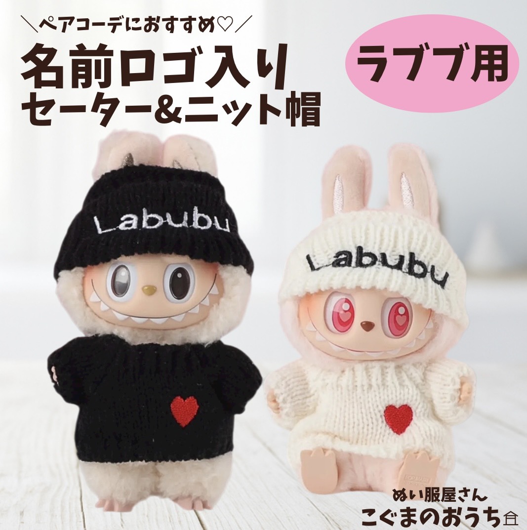 ラブブ服 LABUBU ぬい服 17cm ブラック 黒 ホワイト 白 ロゴ刺繍入り セーター ニット帽セット 1/2/3世代 着せ替え服 ぬいぐるみ服 ぬい活 小物 labubu 推し活