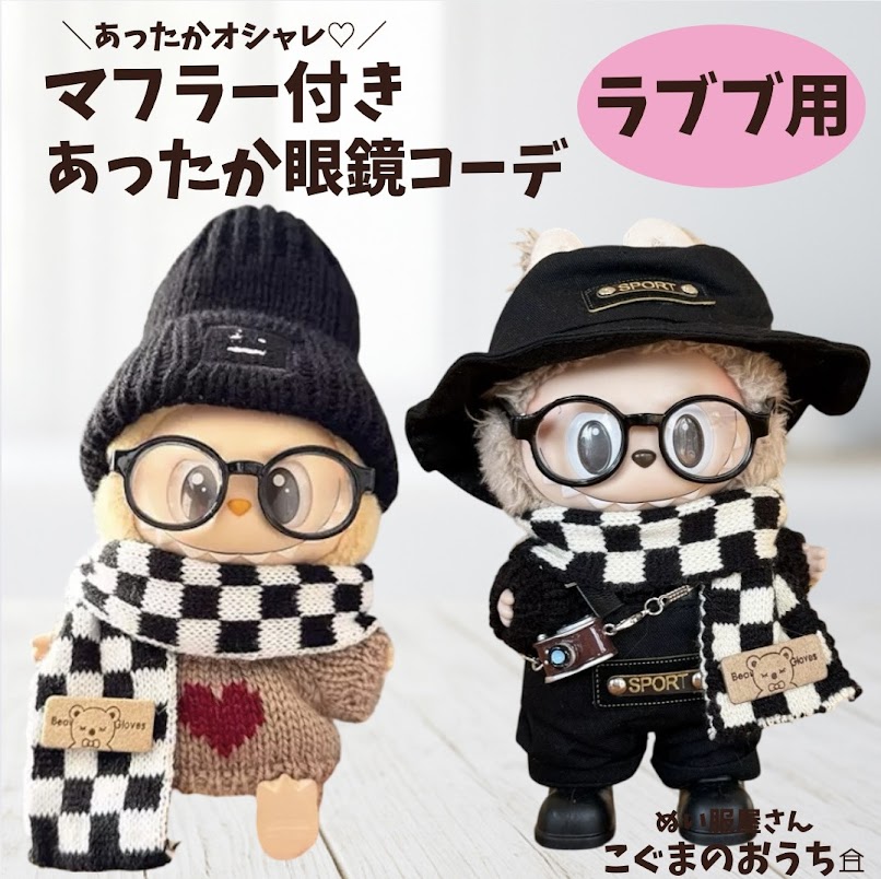 ラブブ服 LABUBU ぬい服 17cm マフラー付き眼鏡コーデ カメラ 靴 帽子 ニット帽 セーター サロペ モノクロ柄 着せ替え服 ぬいぐるみ服 ぬい活 labubu 推し活