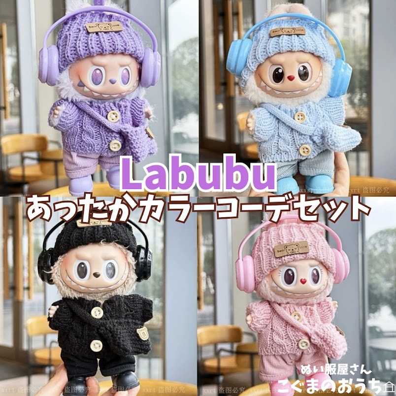 ラブブ服 LABUBU ぬい服 17cm 推しカラーコーデ ニット帽 ヘッドフォン セーター ポシェット 靴 ブルー ピンク ブラック パープル 着せ替え服 labubu 推し活