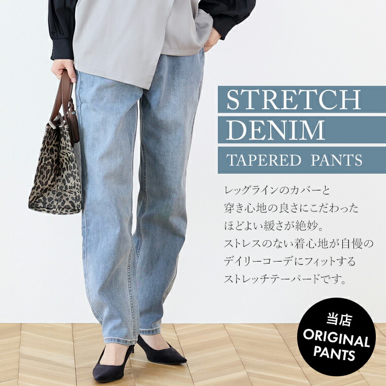 パンツ デニム テーパード デニムパンツ Gパン テーパードパンツ ロングパンツ ロング キレイ見え きれいめ キレイめ 綺麗め 上品 楽ちん イージー イージー素材 ストレッチ 伸縮 ルーズ ゆるめ ストレートパンツ ロングパンツ ストレッチ性 伸縮性 ハイウエスト ハイウェスト ストレスフリー ストレッチ素材 ストレッチパンツ ロング丈 長い 長め ナチュラル ズボン ずぼん 長ズボン 長ずぼん 総ゴム ゴムウエスト ウエストボム ゴムウェスト ウェストゴム ポケット 色落ち ブルー 青 ネイビー 紺 カラバリ豊富 大きめ 大きい ワンマイルウエア ワンマイルウェア レディースファッション 無地 ラクチン らくちん 楽ちん 動きやすい プラスサイズ 着痩せ 華奢見え 脚長 脚長効果 ゆったりサイズ ゆる すっきり カバー 体型カバー きちんと シンプル カジュアル ナチュラル ベーシック オフィス オフィスカジュアル テレワーク 会議 食事会 ランチ 女友達 参観日 二次会 飲み会 上品 知的 女性らしい 女らしい 着映え オンライン飲み会 着回し 大人 大人カジュアル オトナ 女性 綺麗 きれい キレイ キレイめ 高見え 上質 大きいサイズ 細見え 女性服 アースカラー フリーサイズ 楽 ノンストレス 動きやすい ゆったり 高級感 母の日 プレゼント ギフト 贈り物 S M L LL 2L XL 20代 30代 40代 50代 おしゃれ パ―ト バイト 仕事 仕事用 ユニフォーム 春夏 春 夏 秋冬 秋 冬 お洒落 オシャレ かわいい 可愛い カワイイ かっこいい カッコいい FUNNY COMPANY ファニーカンパニー ふぁにーかんぱにー ファニカン