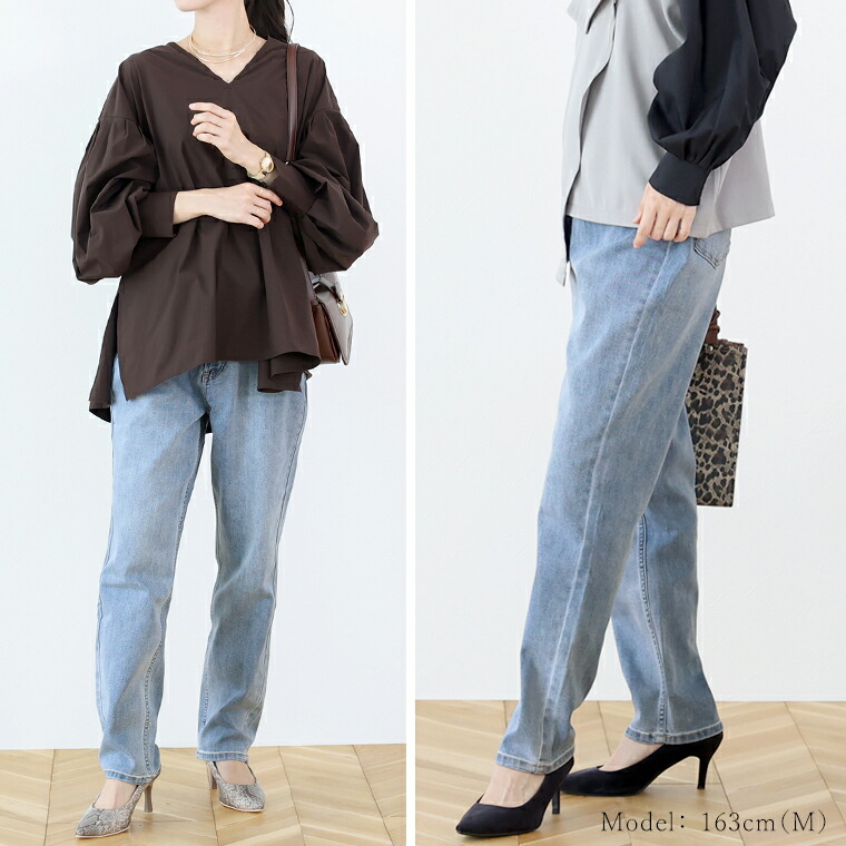 腿周りにゆとりを持たせたほどゆるシルエットが大人の女性に嬉しいテーパードデニム。レッグラインをカバーするだけではなく、穿き心地の良さにもこだわった当店オリジナルの一着です。ノンストレッチ風の本格派な見た目ながら、実は伸縮性に優れたストレッチデニムを採用し、肌あたりの優しいストレスフリーな穿き心地に。全体的にはすっきり見えるシルエットですが、腰や腿周りにゆとりを作りぴったりしすぎないように設定。股上も深めでしゃがんだ時も安心です。通年活躍する素材で、一年通してたっぷり着まわせること間違いなし。