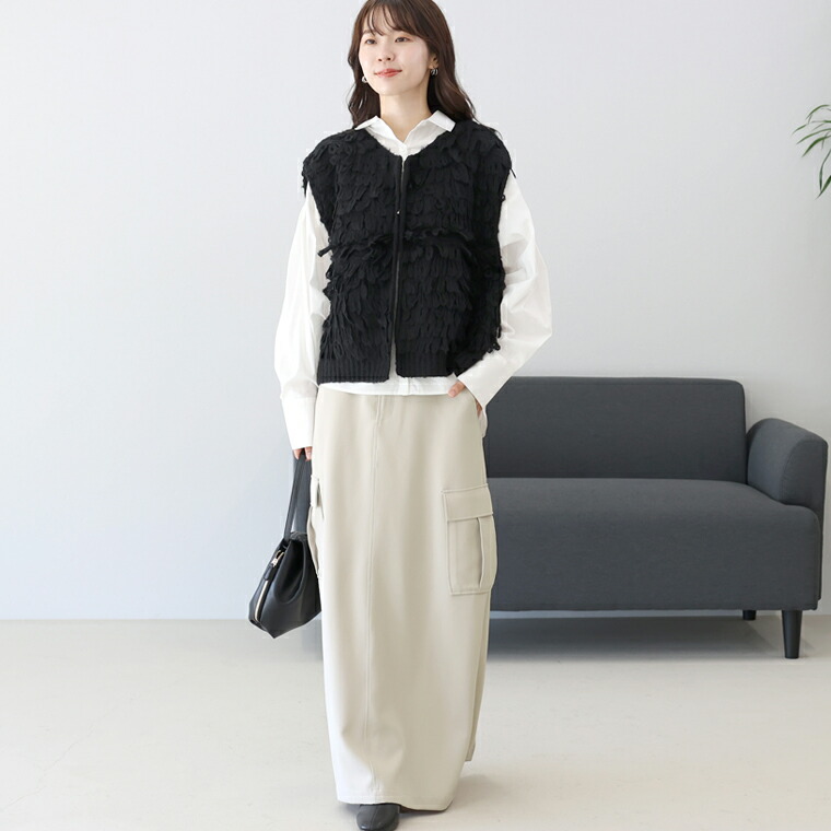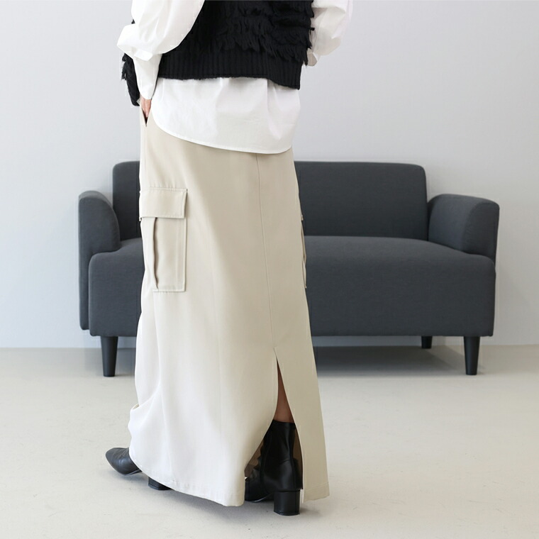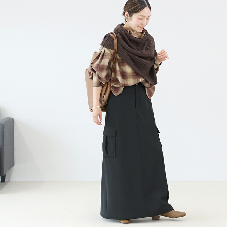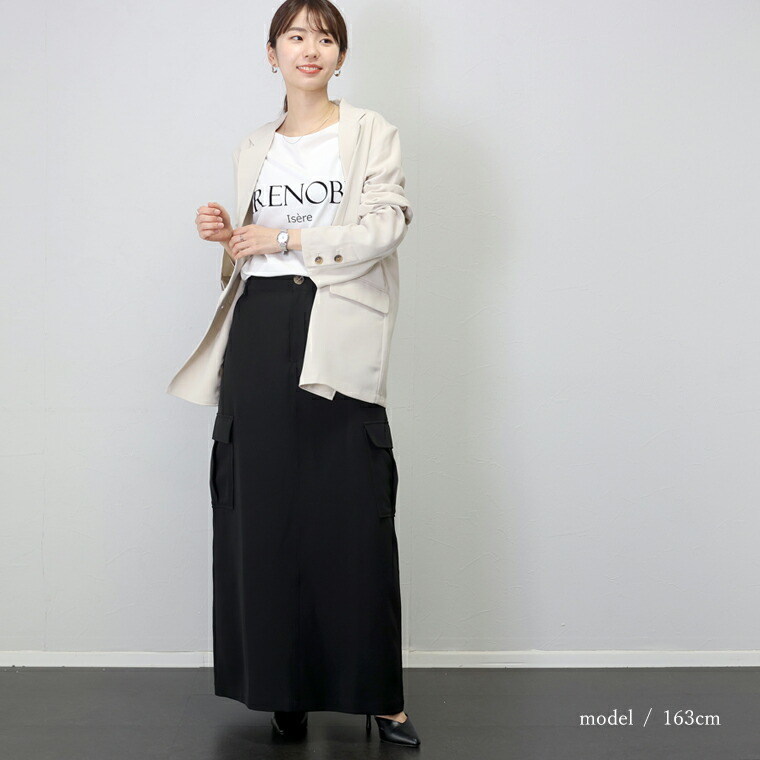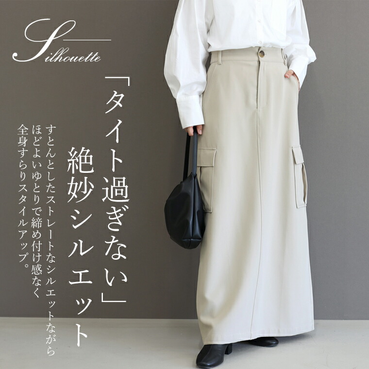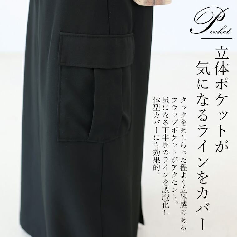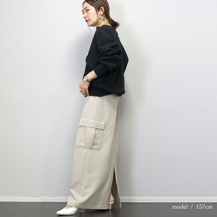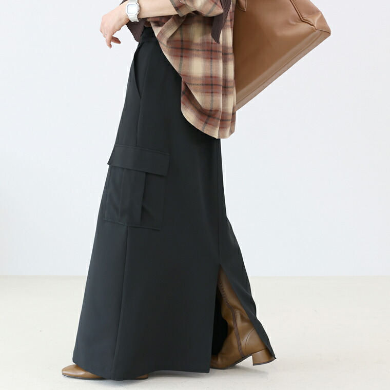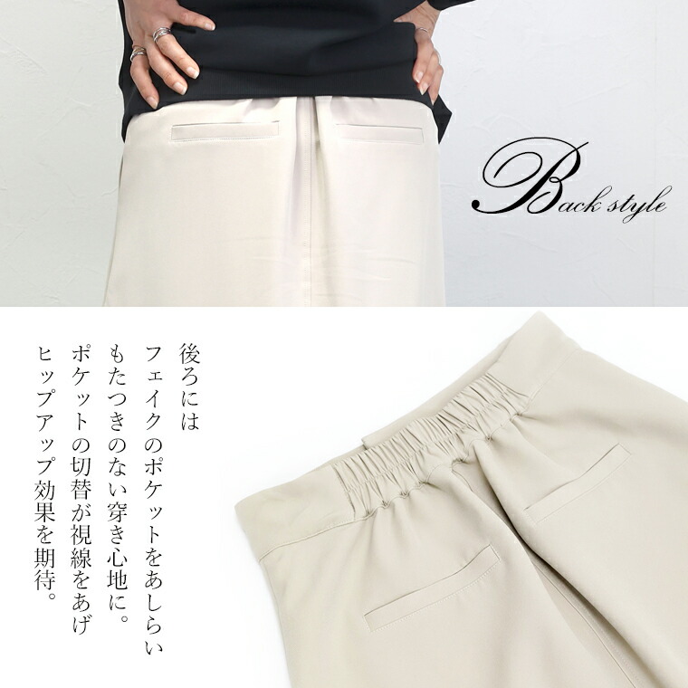 | 着丈はかかとから2cm下。丈が長めなので裾直しをするか高めのヒールで丁度良く穿けそうです。ストンとしていますが脚やヒップのラインは気になりません。脚捌きは楽です。 |