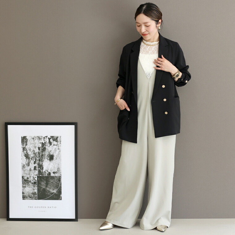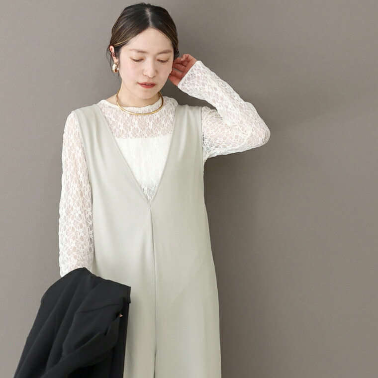 深めのVネックがパンツスタイルを女性らしく仕上げてくれる大人に似合うサロペット。
