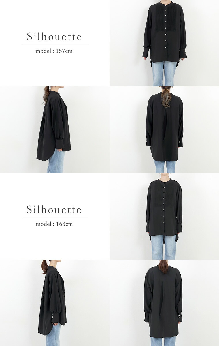 一枚で存在感ある上品な装いに仕上がるピンタックデザインシャツ。丁寧にたたまれたフロントのピンタック使いがきちんと感ある表情をみせ、クラシカルな雰囲気に。さらに、首元をすっきりみせるバンドカラーで大人度もぐんとアップします。生地は、さらさらとした柔らかな肌触りのローン生地を採用。マットな光沢があり、無地ながらもどこか華やかかつ上品な着こなしに。比較的しわにもなりづらくお手入れが簡単なのも嬉しいポイントです。ヒップをすっぽり隠す長めの着丈で、安心してお洒落を楽しめる一着。