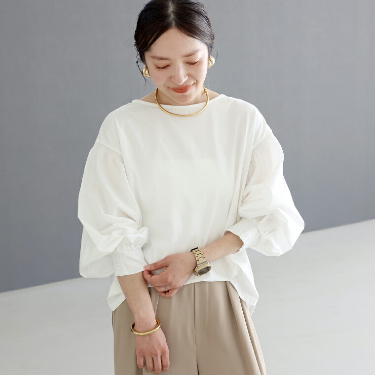 | 着丈はヒップが丁度隠れるくらい。袖丈は手首から4cm下。着丈が長めでヒップをカバーしてくれます。袖口のシャーリングは優しいフィット感で程よく止ります。オフホワイトを着用しましたが透けすぎず、インナーをそんなに気にせず着れそうです。 |
