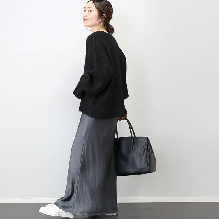 | 着丈はヒップが3分の2隠れるくらい。袖丈は手首から22cm下。袖丈は長めですが広めのリブで腕まくりをしても止ります。袖にも身幅にもゆとりがあります。厚手で体のラインを拾わず◎。 |