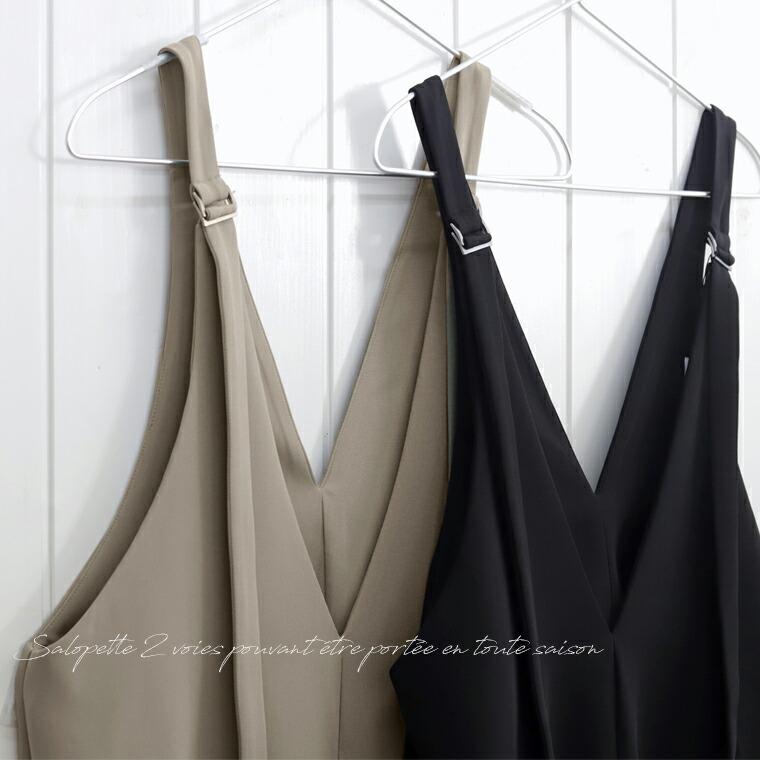 | 肩紐を一番短くした状態で、着丈は床スレスレ。股合わせの位置が下の方になっているので股上が深く安心して着れるデザインです。ヒップまわりは全く形が出ず太もも幅もかなり広いですが、ぞんなに大きく感じません。小柄な方でも着やすく◎。 |