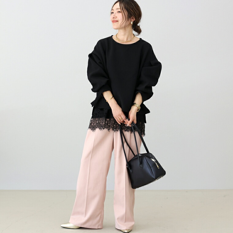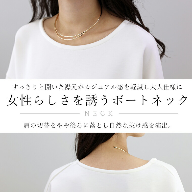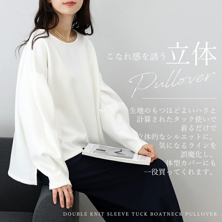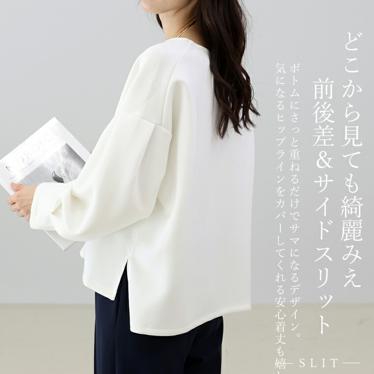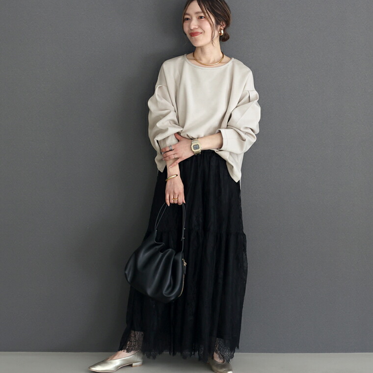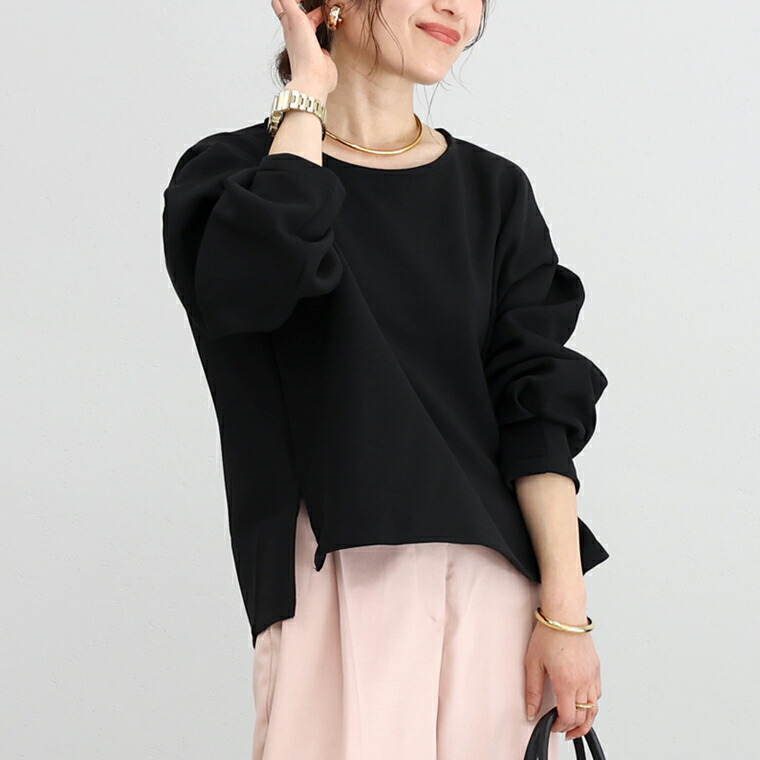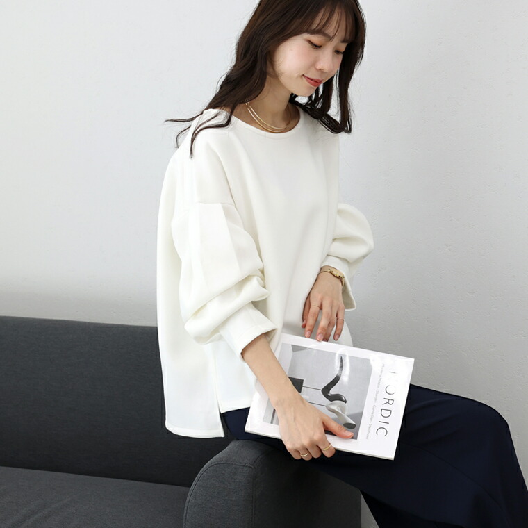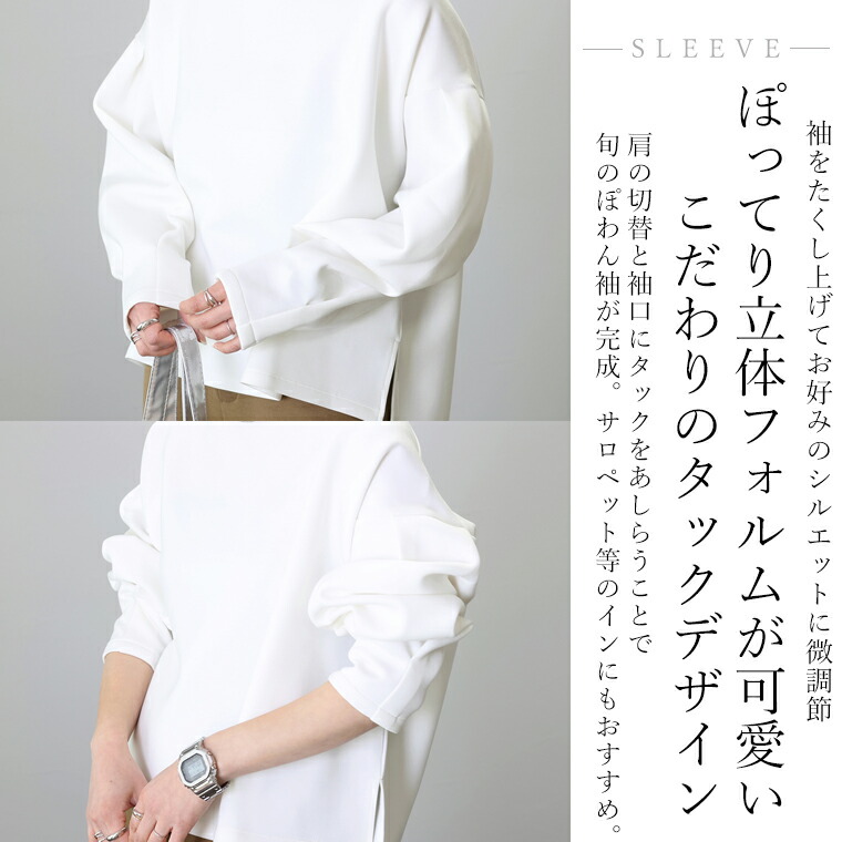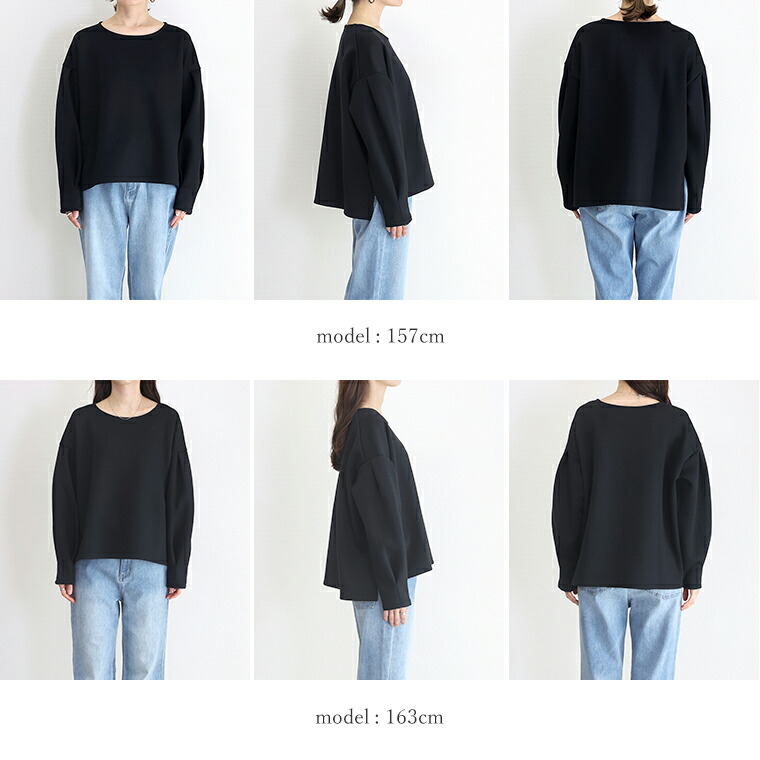 | 着丈はヒップが少し出るくらい。袖丈は手首から10cm下。ゆったりしたシルエットで伸縮性もありとても楽です。袖がボリュームシルエットで二の腕カバー◎。首まわりの開きが少し広めに感じるのでインナー見えに注意したいです。 |