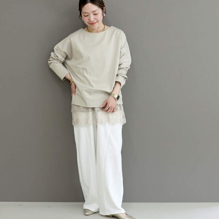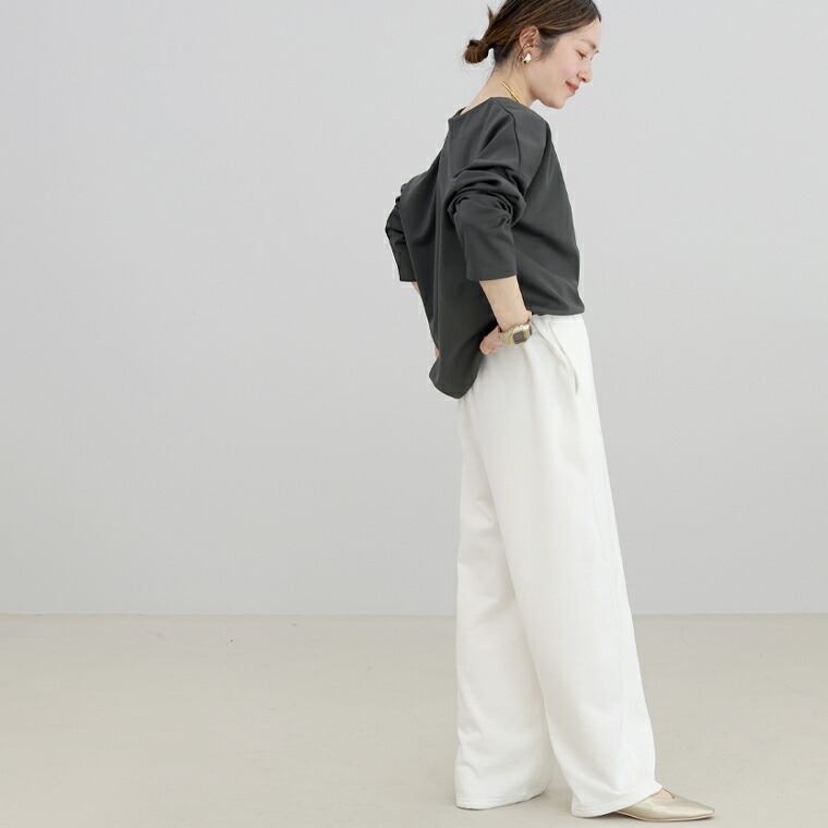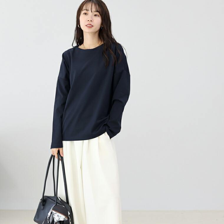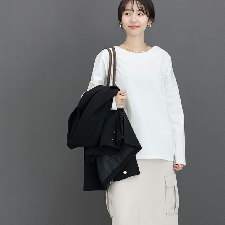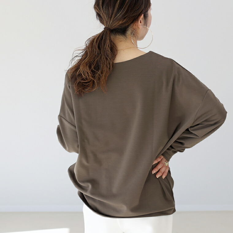 | 着丈はヒップが3分の1隠れるくらい。袖丈は手首から9cm下。身幅にゆとりがあり窮屈なく着れます。シンプルデザインでパンツにもスカートにも合わせやすそうです。首まわりは広すぎず安心感があります。 |