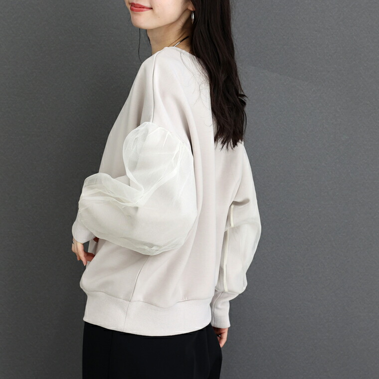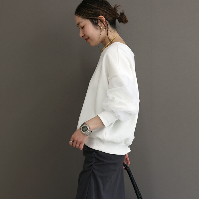 | 着丈はヒップが少し出るくらい。袖丈は手首から15cm下。全体的にゆとりを持って着れます。袖口のリブは窮屈さはありませんが腕まくりをするとしっかり止まります。裾のリブは体にフィットせず余裕があります。素肌に着ても肌あたりが良く柔らかい生地です。 |