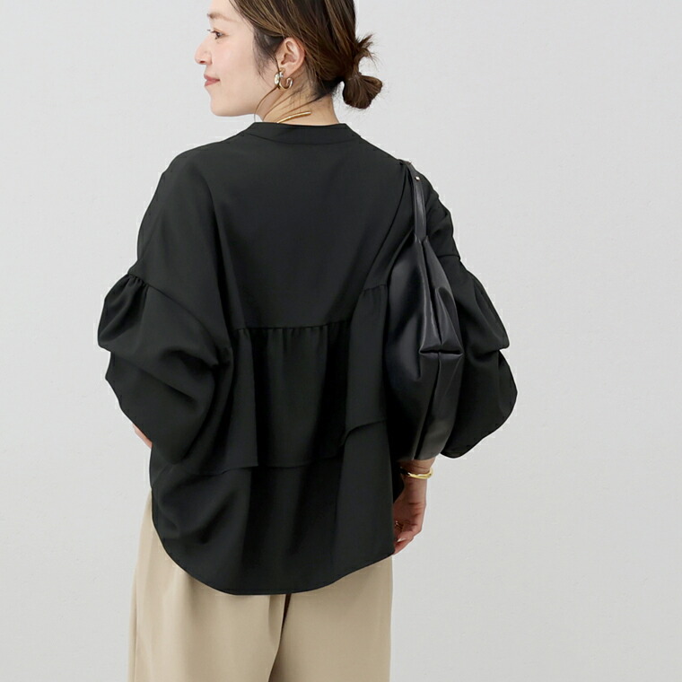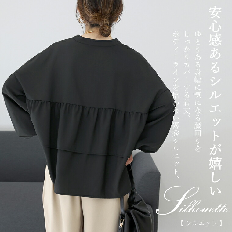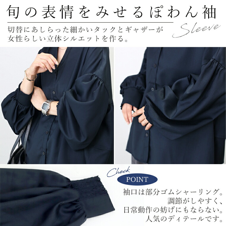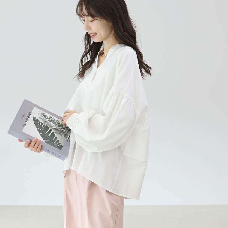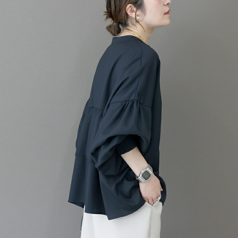| 着丈はヒップが3分の2隠れるくらい。袖丈は手首から9cm下。全体的に大き目な作りに感じます。袖口のシャーリングはきつさはなく、腕まくりをすると楽にとまります。首元が開いているので顔まわりがスッキリ見えます。 |