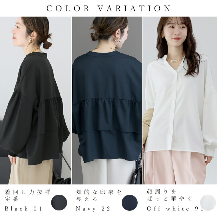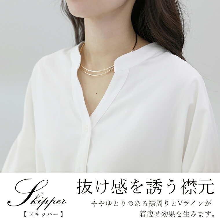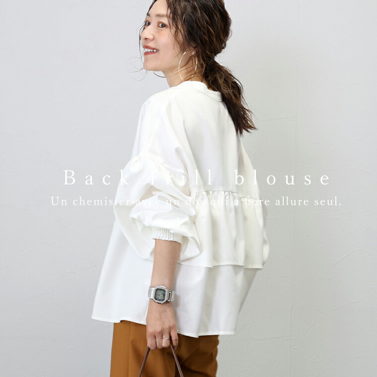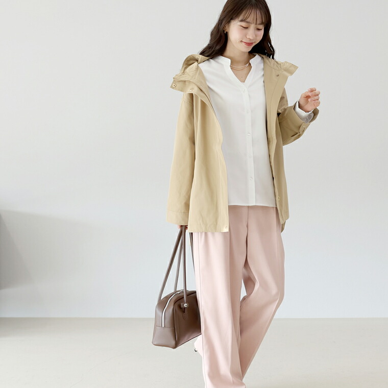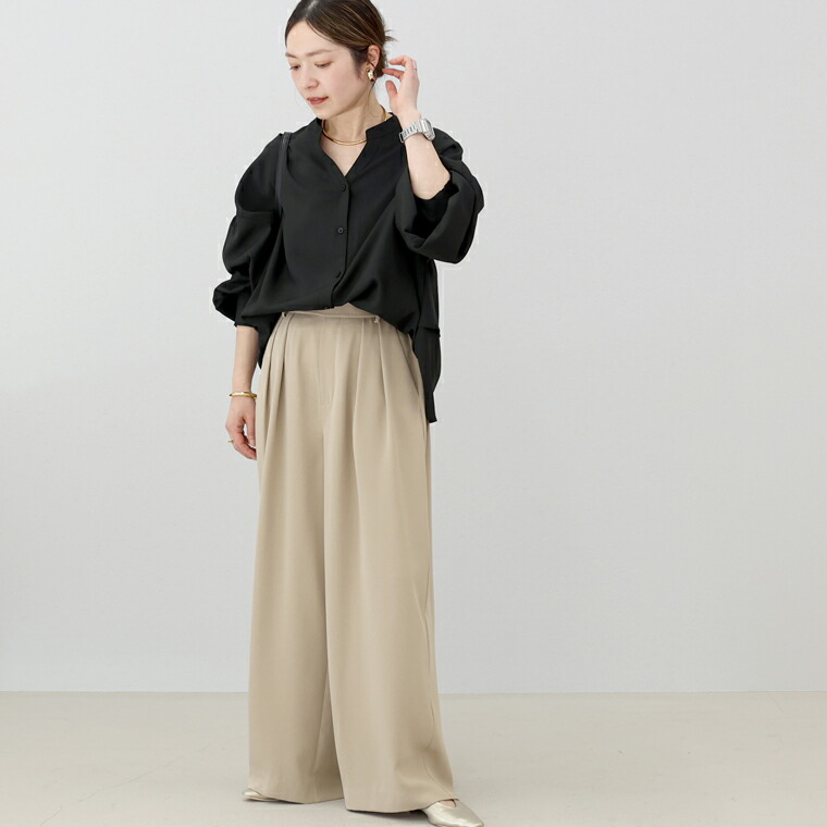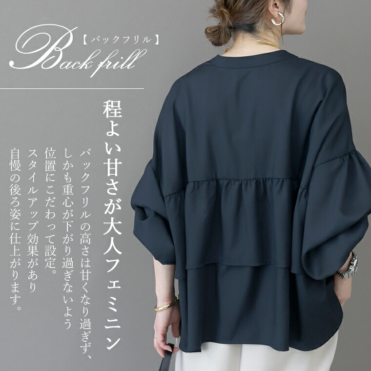| 着丈はヒップが3分の2隠れるくらい。袖丈は手首から9cm下。全体的に大き目な作りに感じます。袖口のシャーリングはきつさはなく、腕まくりをすると楽にとまります。首元が開いているので顔まわりがスッキリ見えます。 |