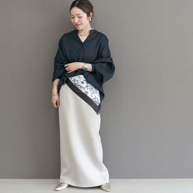 | 着丈はヒップが半分隠れるくらい。袖丈は手首から8cm下。少し大きめのサイズ感で中に厚い物を着ても窮屈さはありません。袖のシャーリングはしっかりしていますがキツさは無いです。袖にボリュームがあり◎。 |
