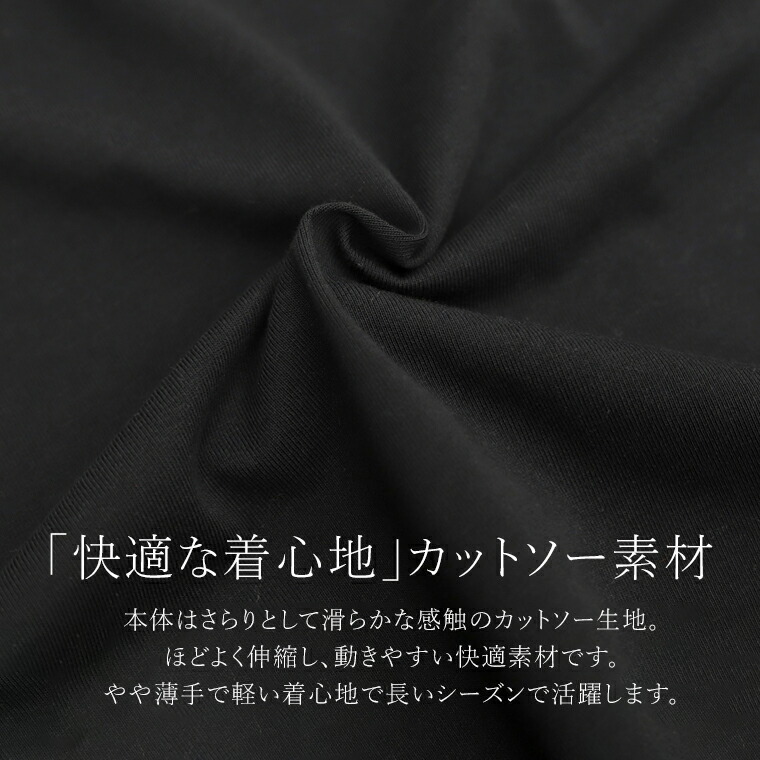 | 着丈はヒップから9cm下。袖丈は手首から15cm下。身幅は広めでゆったりしています。Aラインシルエットで裾までかなりゆとりがあります。身生地はやや薄手のカットソーで伸縮性があり着心地がとても楽チンです。 |