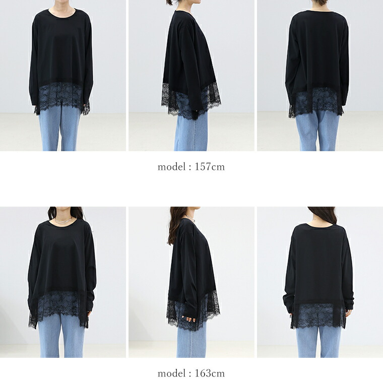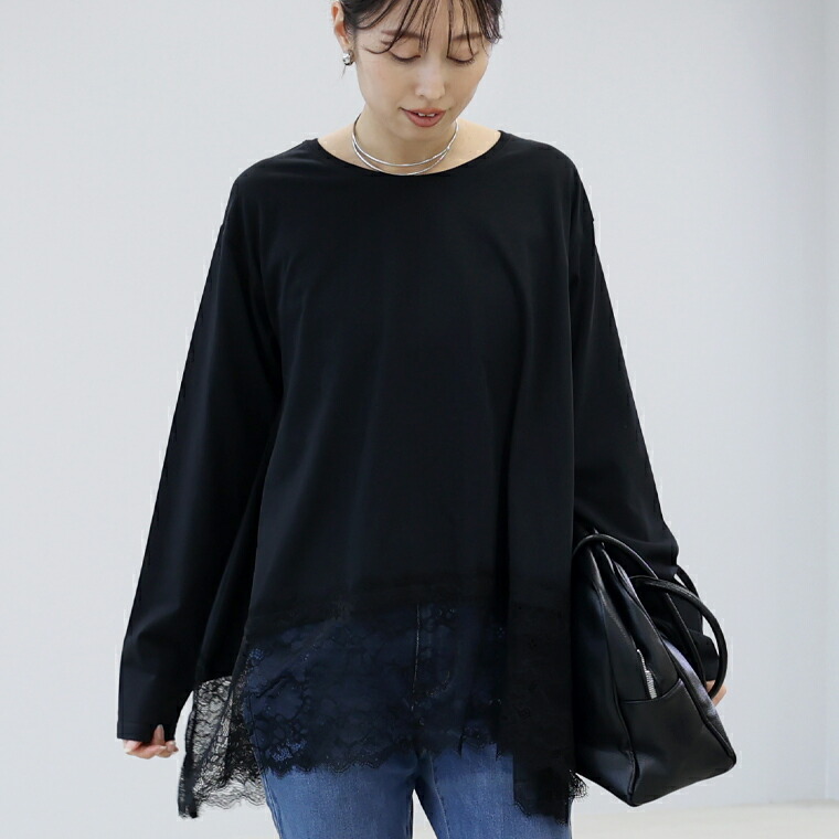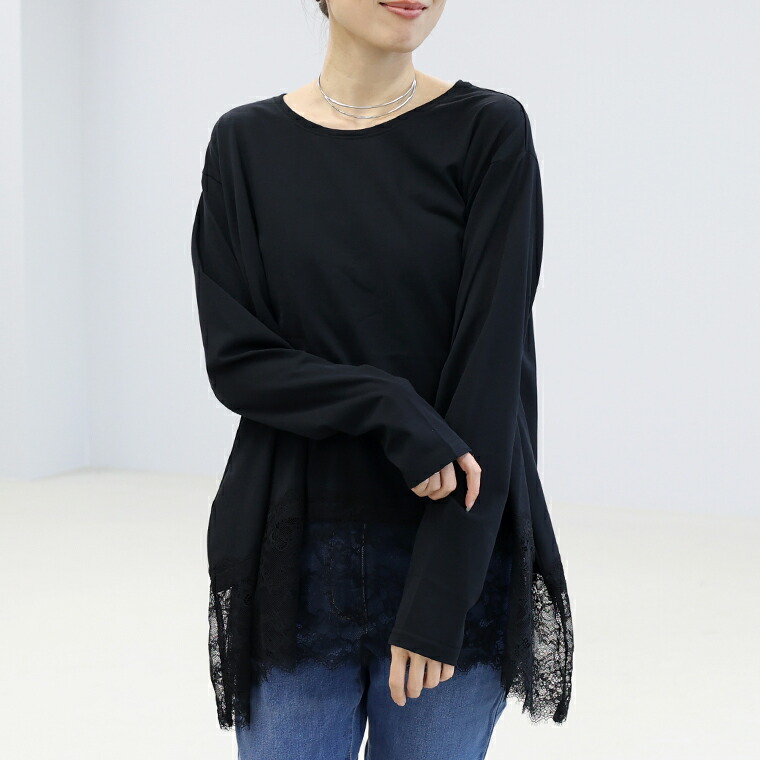 最終入荷 トップス 体型カバー 無地 カットソー ロンT チュニックカットソー 裾レース 30代 40代 春 T/Cフライス裾レース長袖カットソー メール便可/ma3