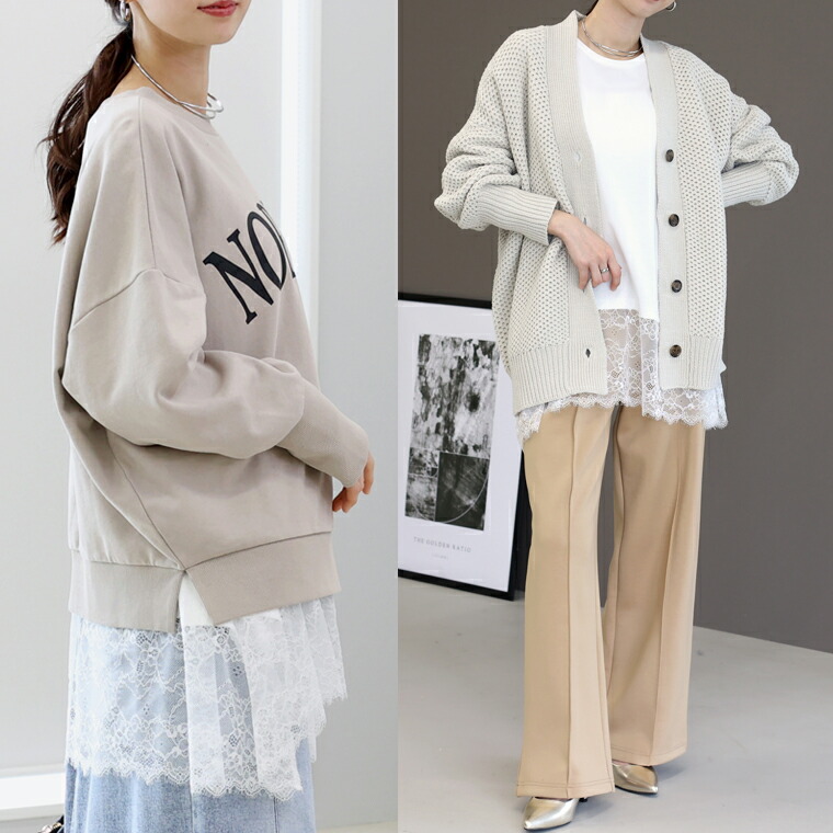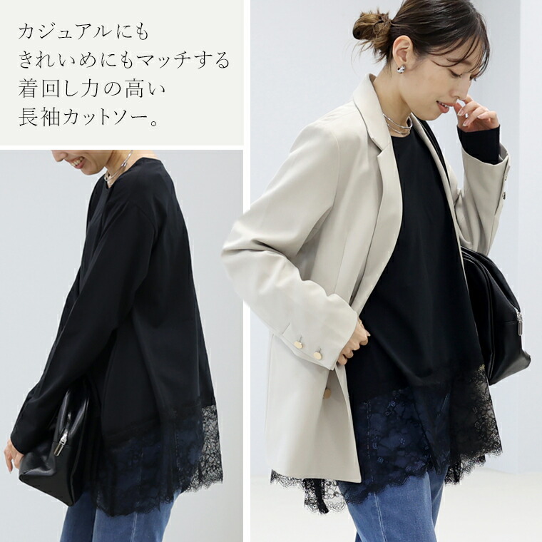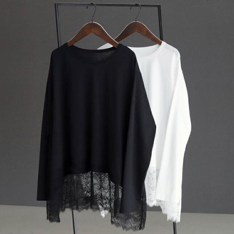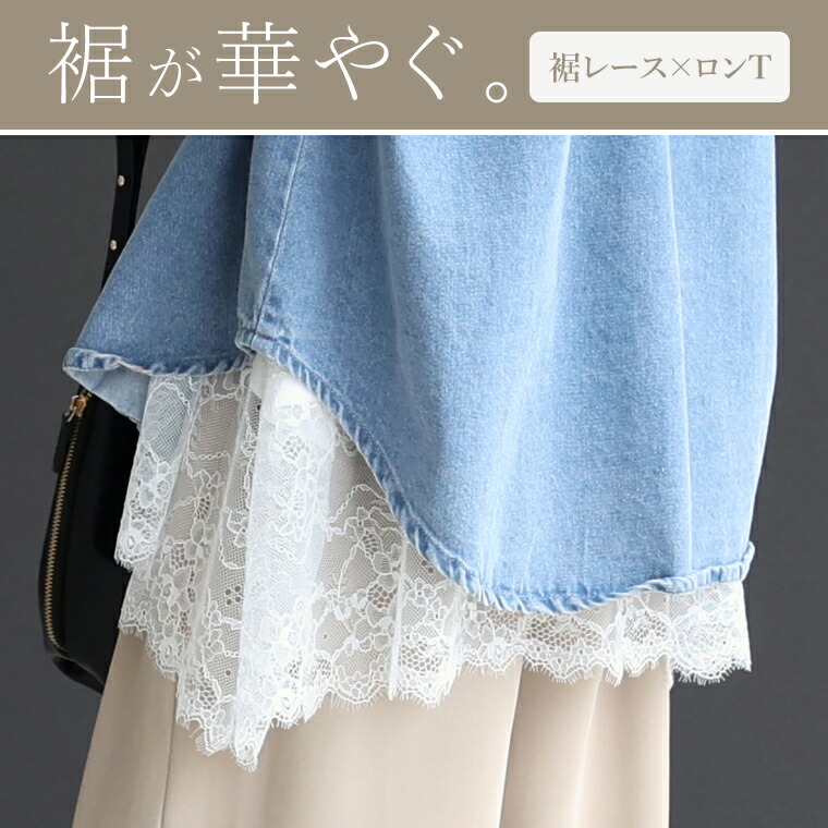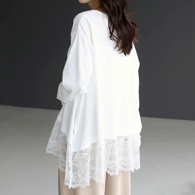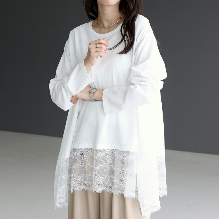 トップス 体型カバー 無地 カットソー ロンT チュニックカットソー 裾レース 30代 40代 大人カジュアル 春 レディース