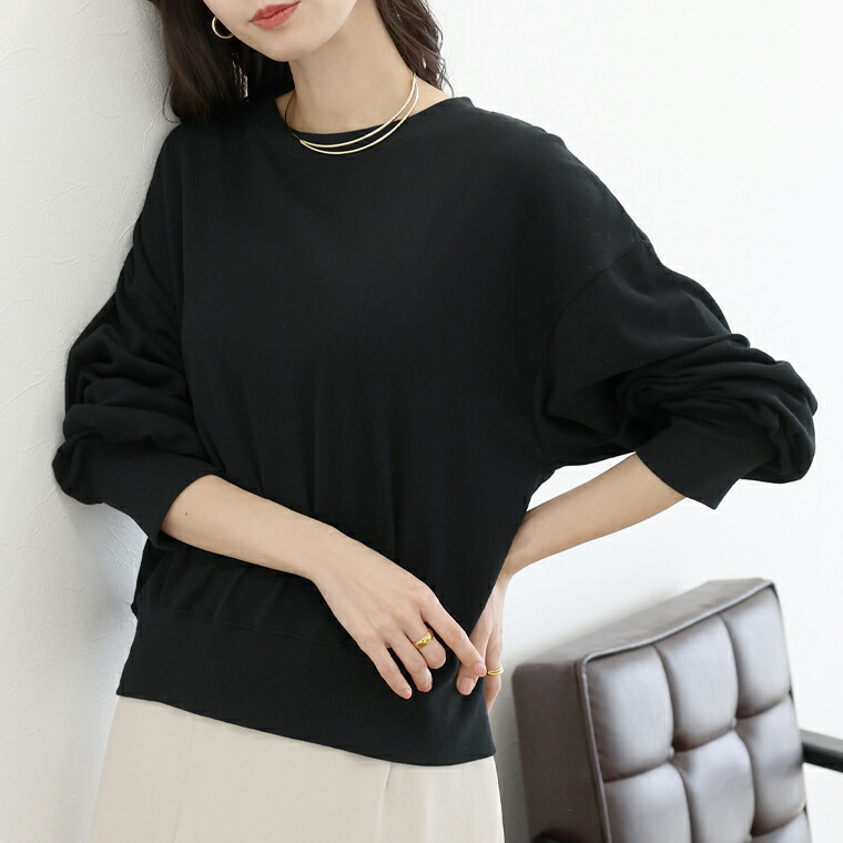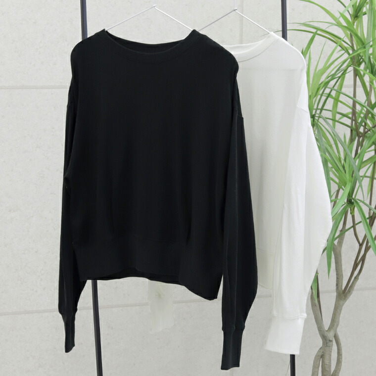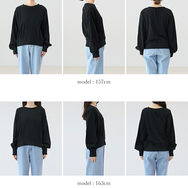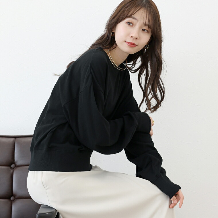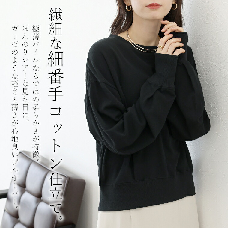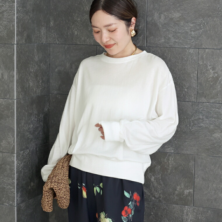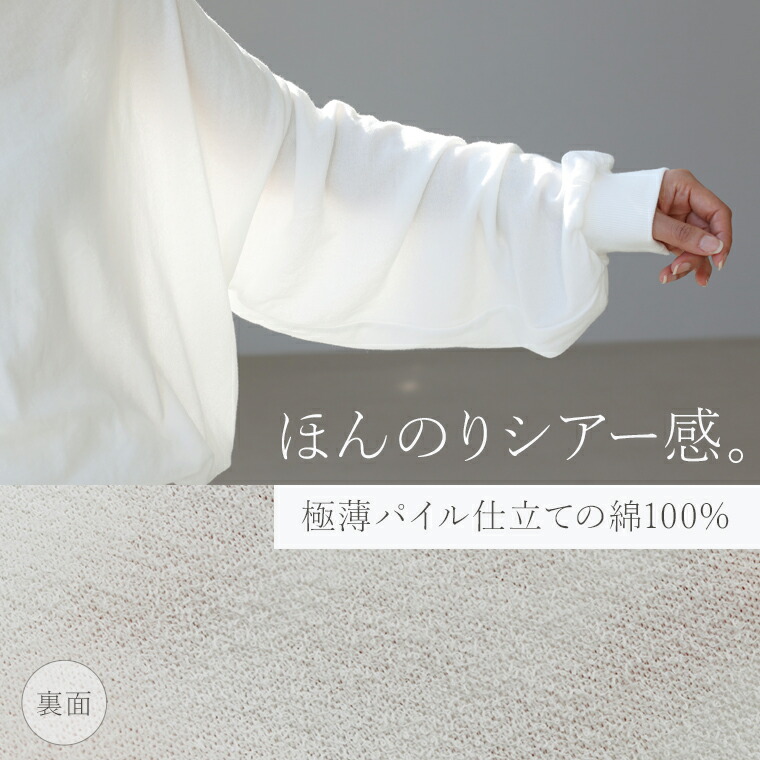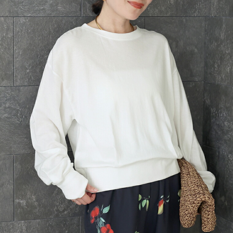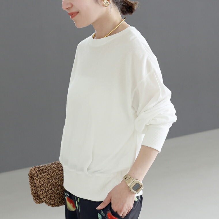 | 着丈はヒップが半分隠れるくらい。袖丈は手首から24cm下。程よくゆとりがあります。テロンとした生地ですがリブがしっかりしているのでルーズに見えすぎず◎。薄手なので夏でも着れそうです。 |