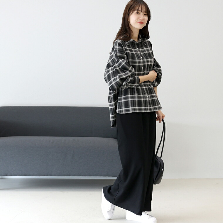 | 着丈はくるぶしから5cm上。伸縮性がありウエストも総ゴムで楽チンですが薄手の生地なので透け感注意です。タイトですがスリットが入っていて脚捌き◎。 |