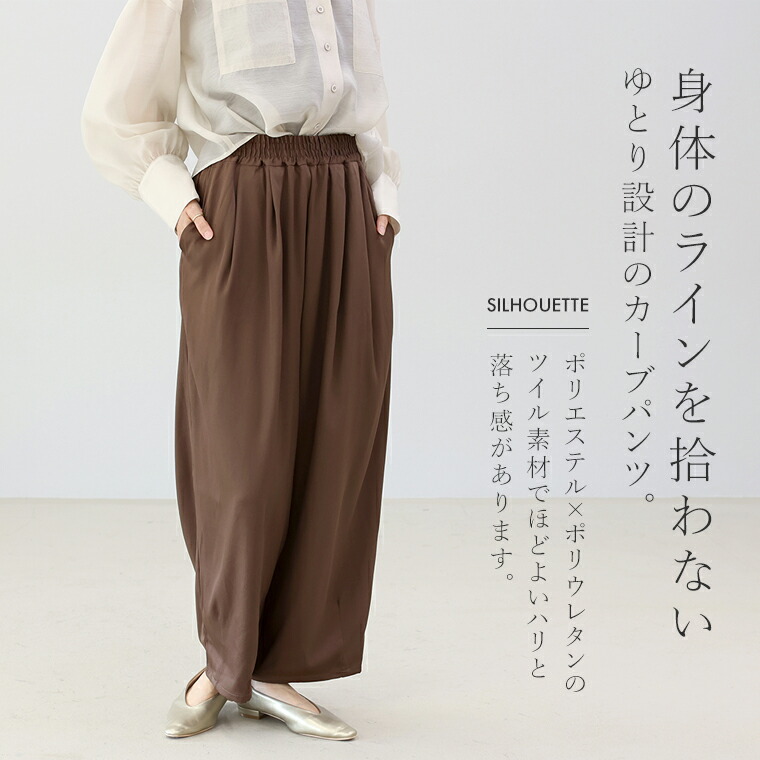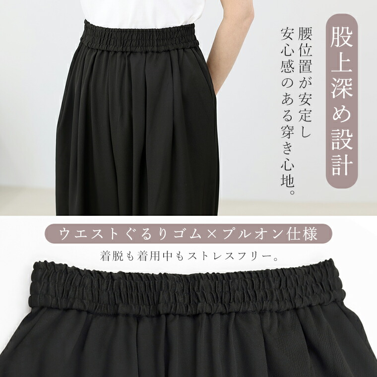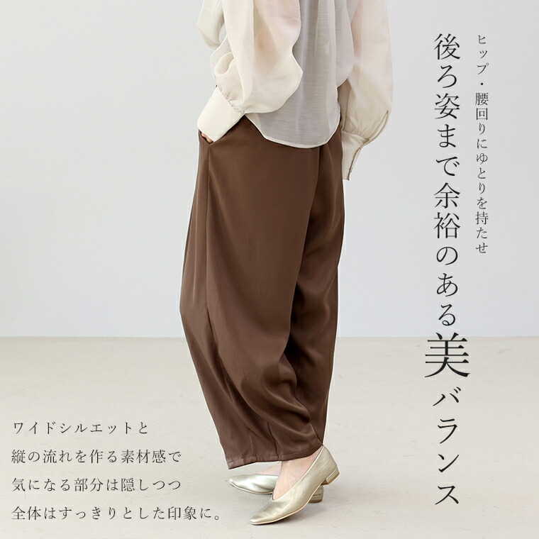 | 着丈はかかとから4cm下。裾が床にずってしまうのでヒールは必須です。ウエストは総ゴムで窮屈なく穿け、落ち感があるのでラインを拾わず◎。 |