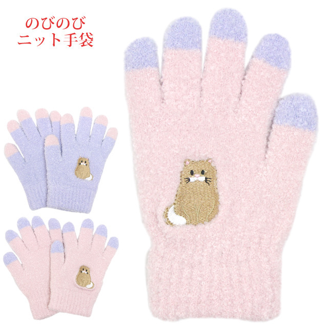 のびのび手袋 手袋 ニット 五本指 キッズ 女の子 ネコ柄 子供 子供手袋