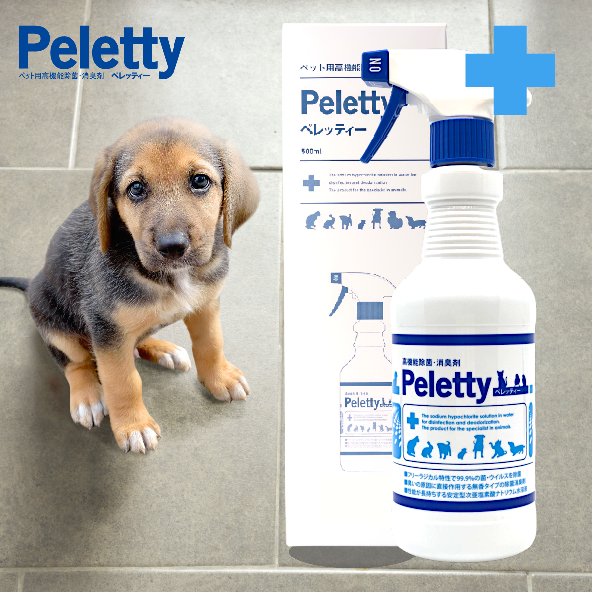 「ペレッティー」は、従来製剤のデメリットを改善し、ペットが舐めても問題のない安全レベルの動物病院業務用除菌・消臭製剤として開発されました。