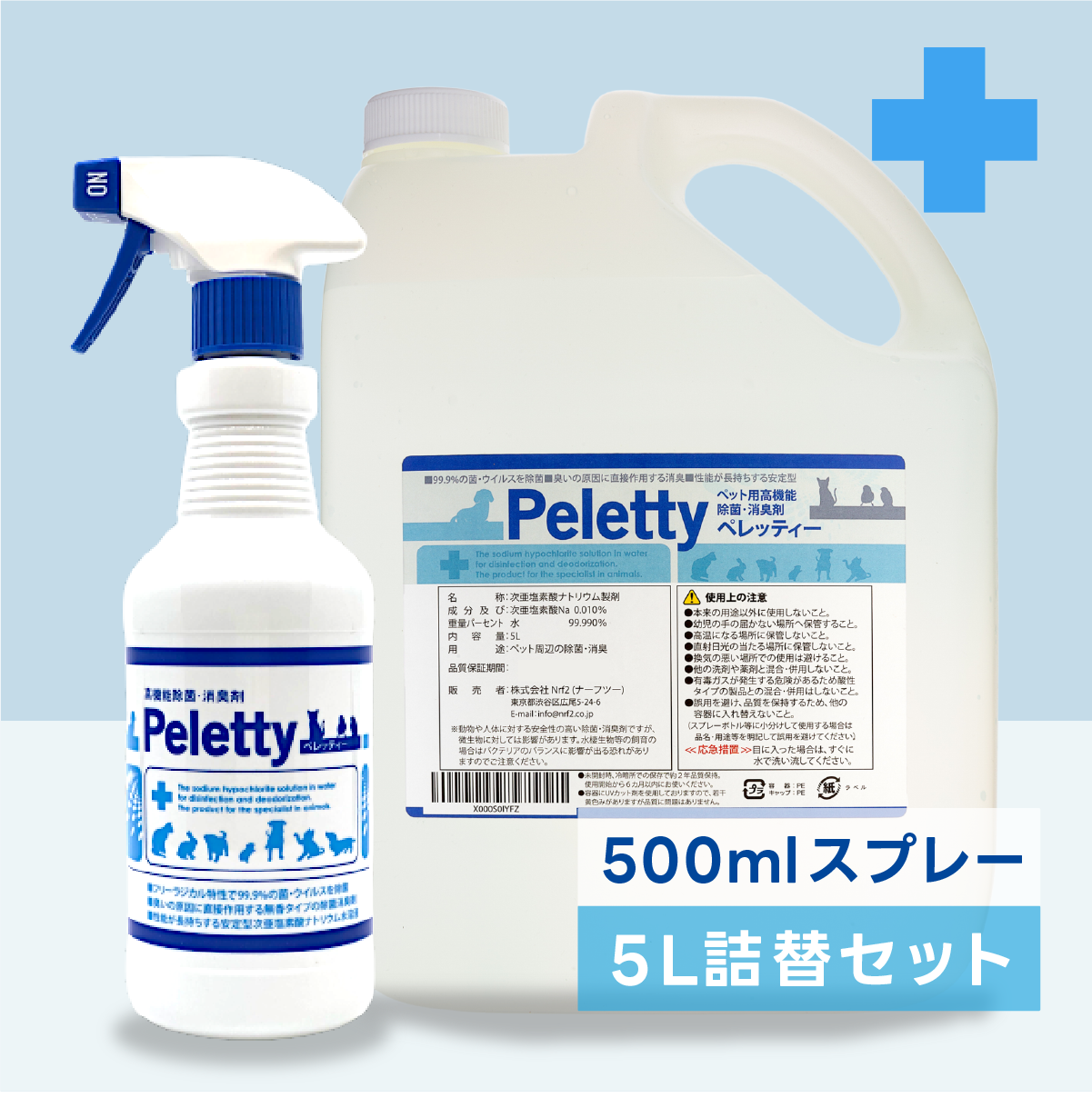 ペレッティー お徳用 消臭スプレー ペット用 500ml + 詰替え用 5L 除菌もできる 次亜塩素酸水 舐めても安心 セット商品 Peletty 次亜塩素酸ナトリウム 猫
