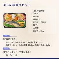 あじの塩焼(あじ(ニュージーランド産))、厚焼卵、餃子、切干大根煮付、白きくらげ天、肉団子、おくら、人参煮付/調味料(アミノ酸等)、pH調整剤、酸味料、酒精、保存料(安息香酸Na、ナイシン)、凝固剤、乳化剤、ソルビトール、加工でん粉、着色料(カラメル)、リン酸塩(Na、K)、シリコーン、乳化剤、グリシン、香料、香辛料抽出物、(一部に小麦・卵・乳成分・大豆・豚肉・鶏肉・魚介類を含む)