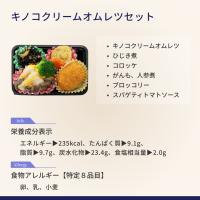 きのこクリームオムレツ(オムレツ(鶏卵:国産)、クリーム、マッシュルーム)、コロッケ、ブロッコリー、人参煮、がんも煮、スパゲティトマトソース、ひじき煮/調味料(アミノ酸等)、pH調整剤、酸味料、酒精、着色料(パプリカ)、香料、酸化防止剤(V.E、V.C)、乳化剤、シリコーン、凝固剤、加工でん粉、リン酸塩(Na)、増粘剤(グァーガム)、保存料(安息香酸Na)、(一部に小麦・卵・乳成分・大豆・鶏肉・豚肉・ごま・魚介類を含む)