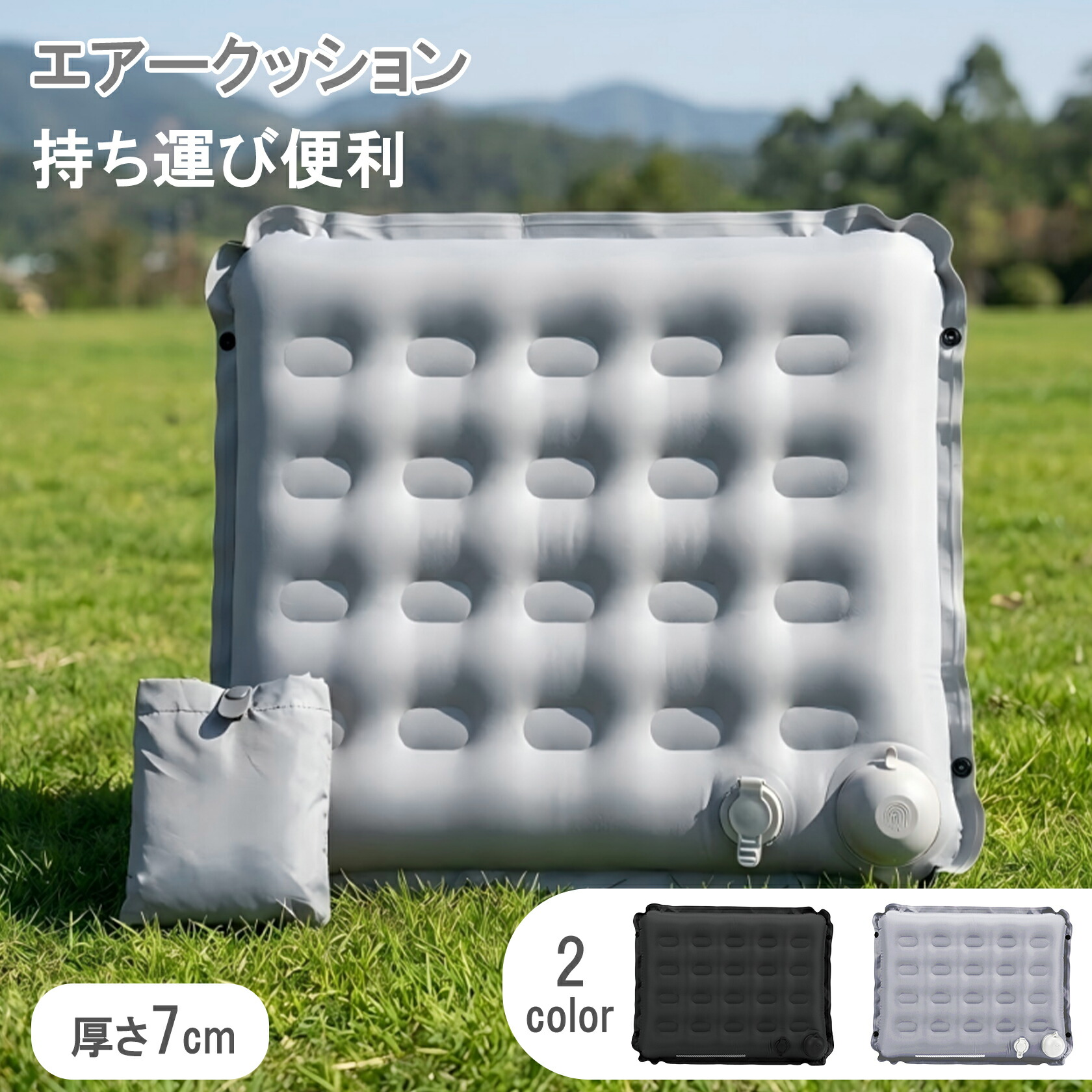 エアークッション アウトドア 座布団 ポンプ内蔵 折りたたみ 超軽量125g 極厚7cm 40Dナイロン TPU加工 防水 防湿 コンパクト 携帯 エアーマット キャンプ