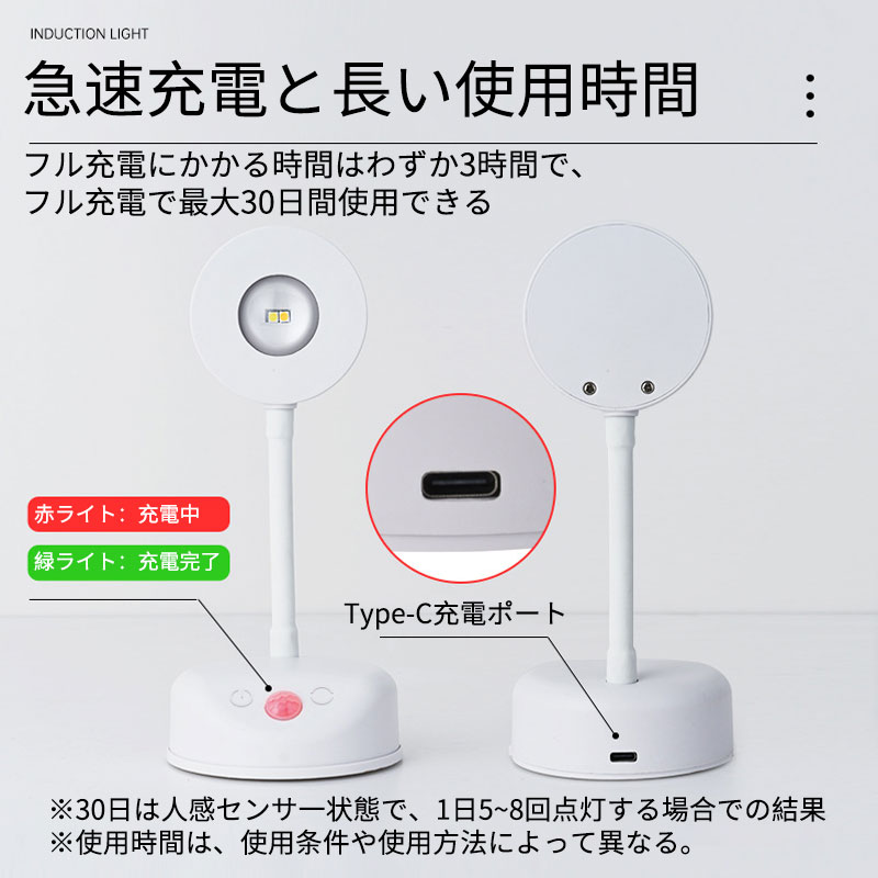USBボートで充電でき、電池交換も配線やコンセント接続も不要。USBボートは充電時間約3時間、過充電・過放電の防止システムも搭載しています。(使用時間はモードや輝度によって違います)