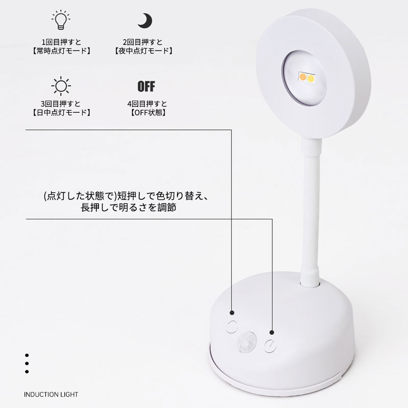 【常時点灯モード】⇒【夜中点灯モード】⇒【日中点灯モード】⇒【OFF】