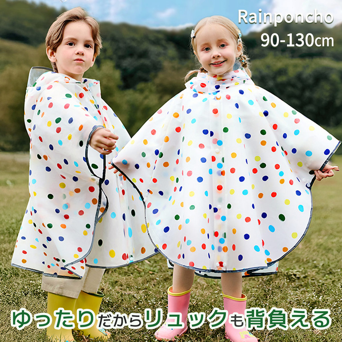 レインポンチョ キッズ 子供用 カラフル レインコート 男の子 女の子 ランドセル対応 ドット・水玉柄 レインカバー 完全防水 反射材付き 透明窓付き 通園 通学