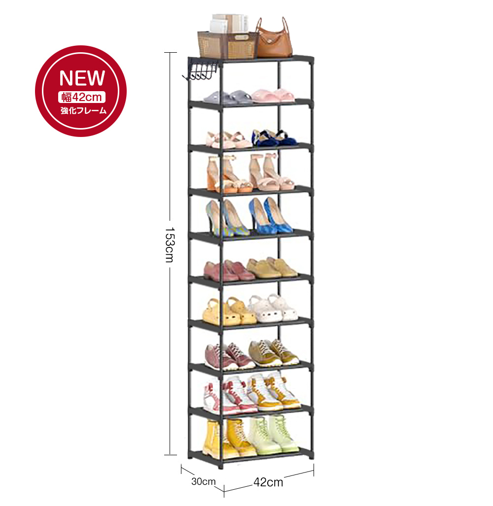 安定感のある強化モデル シューズラック 10段 幅42cm 安定感アップ フック付き 多層収納 大容量 靴箱 下駄箱 組立簡単 スリム設計 省スペースで置きやすい