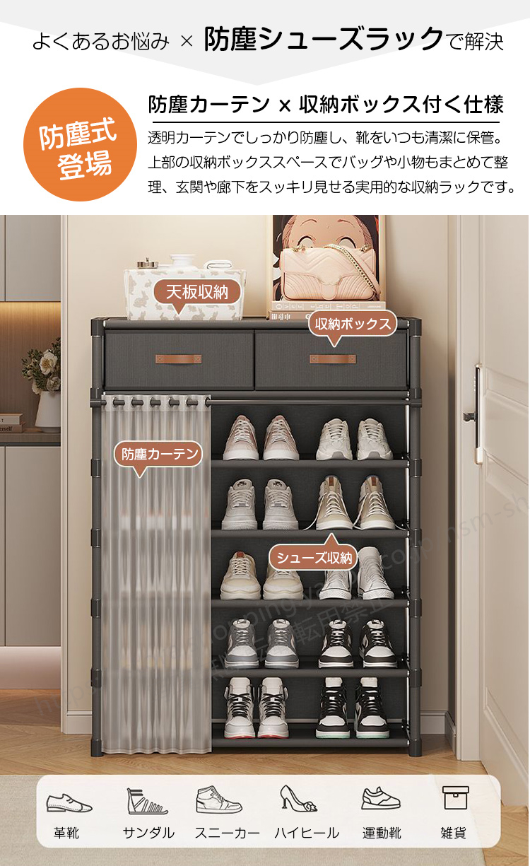 2025最新登場 玄関収納 靴箱 防塵シューズラック 引き出し2つ付き 多層収納 防塵カーテン スリム 靴収納ラック 組立簡単 スッキリ整理 シンプル 省スペース