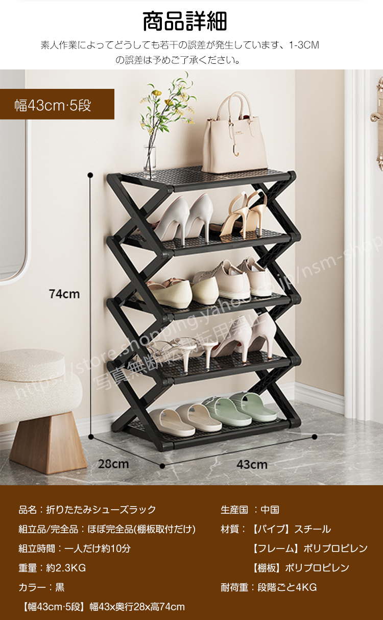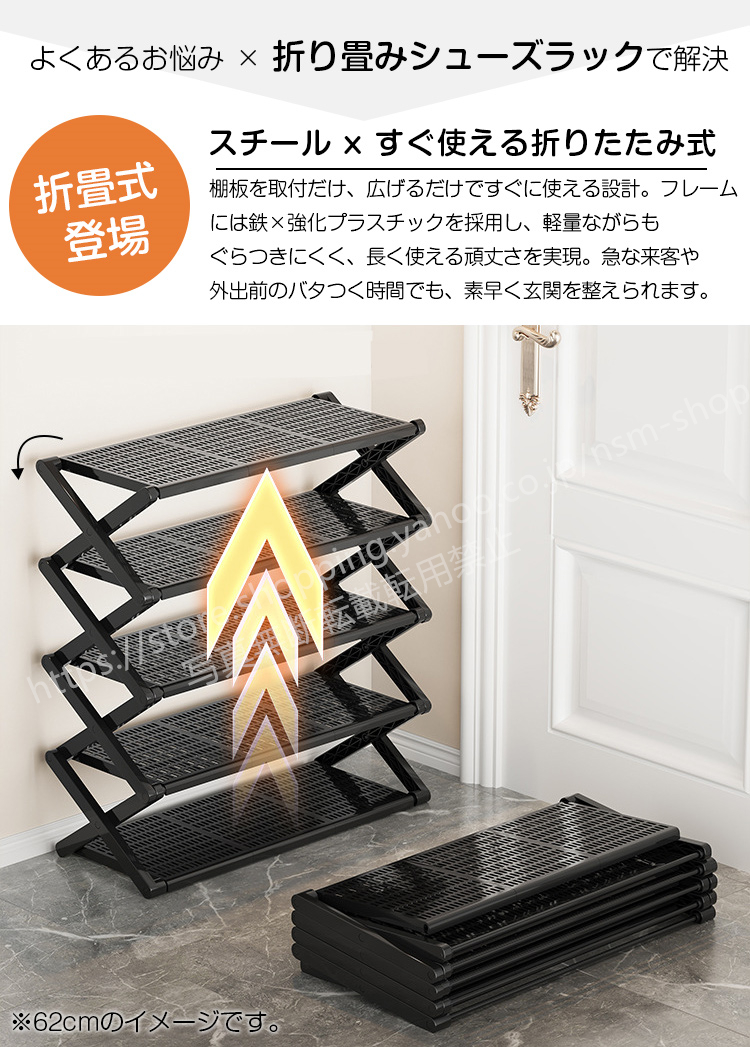 シューズラック 折りたたみ シューズ収納 靴箱 下駄箱 水平 幅42cm 5段式 約10足収納 スリム 大容量 靴棚 ほぼ完成品 玄関 折りたたみボックス 新生活 ブラック