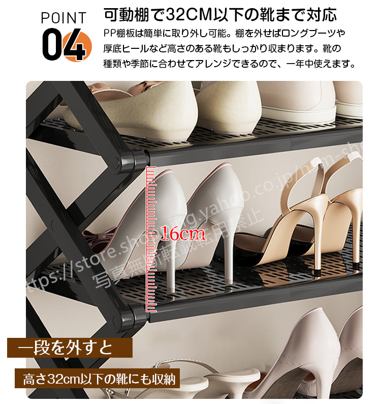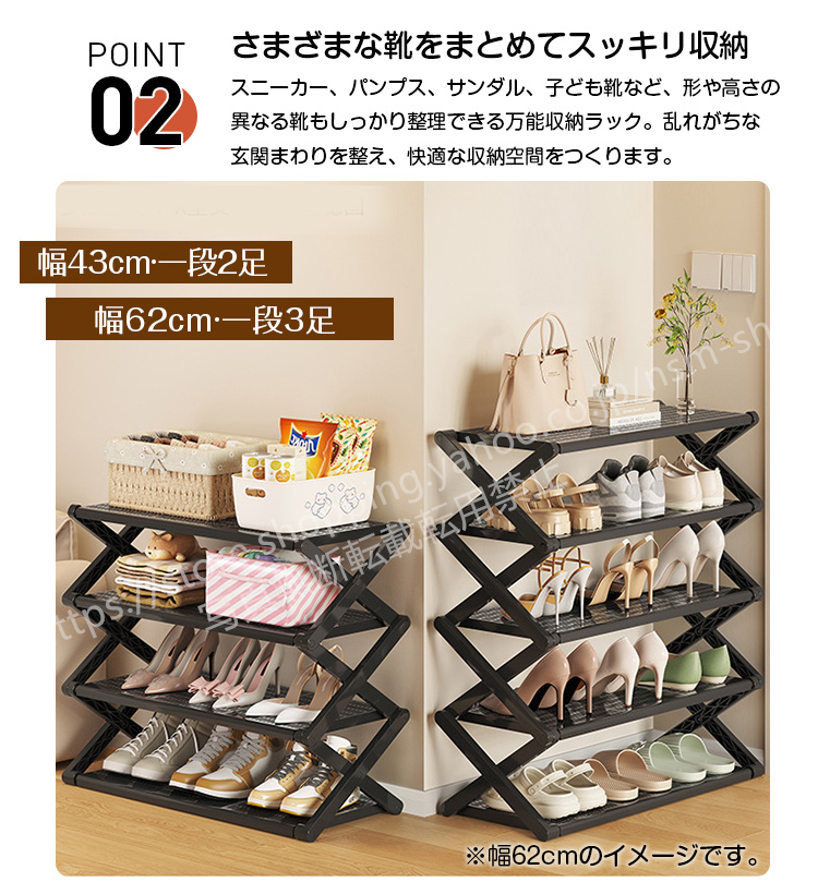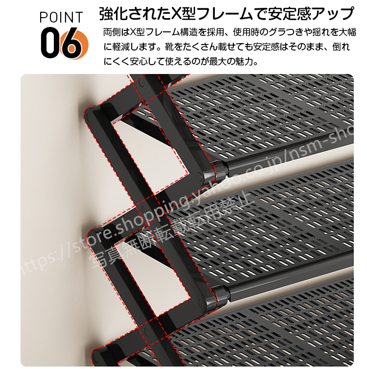 強化されたX型フレームがしっかり支え、揺れにくく安定。靴やバッグなどを安心して収納できます。