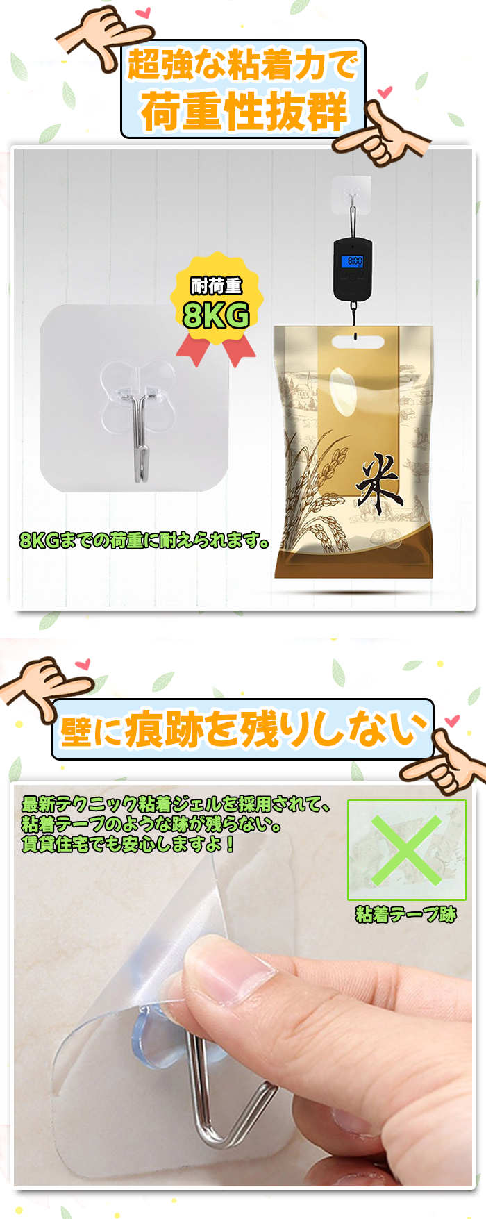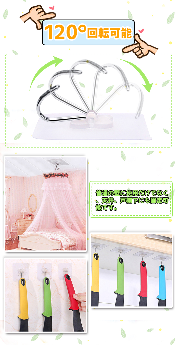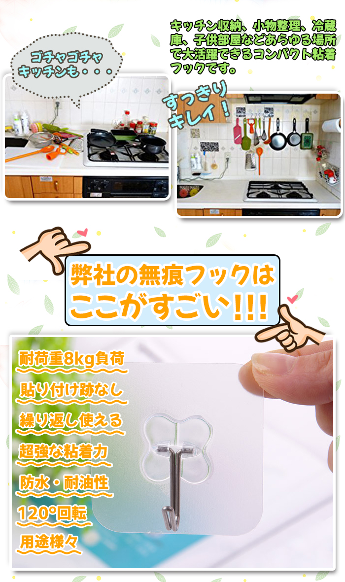 他のフックよりずっと粘り強くて長持ちします。釘のようにしっかりと壁に接着して落ちにくいです。粘着フックは釘やピンを使わないため、壁を傷つけず、穴をあけない、キズ跡なくスペースを有効活用できます。効率よく収納できて毎日の家事が楽しくなるようなお気に入りの粘着フックが手に入りますように♪