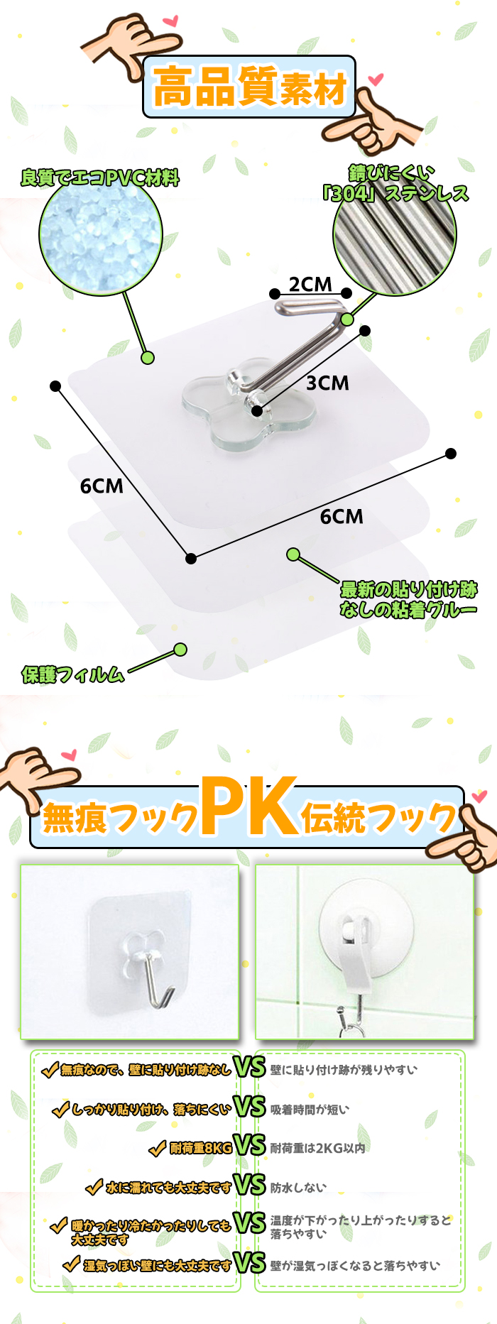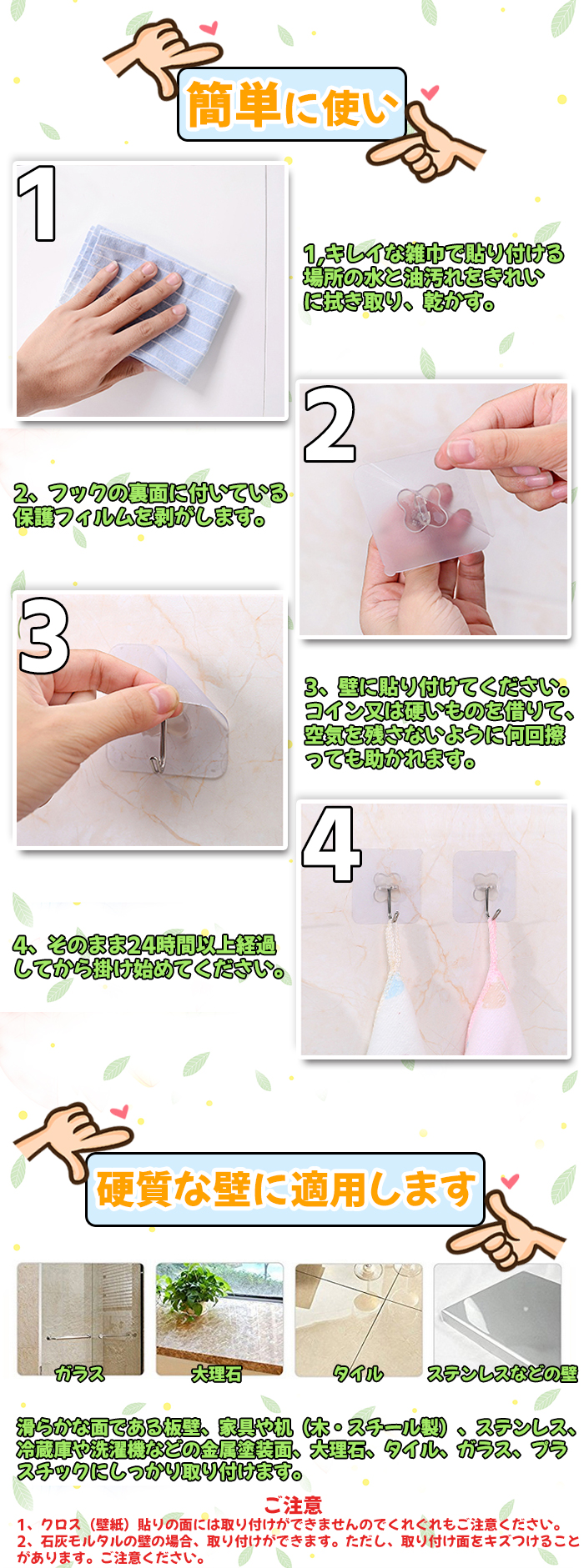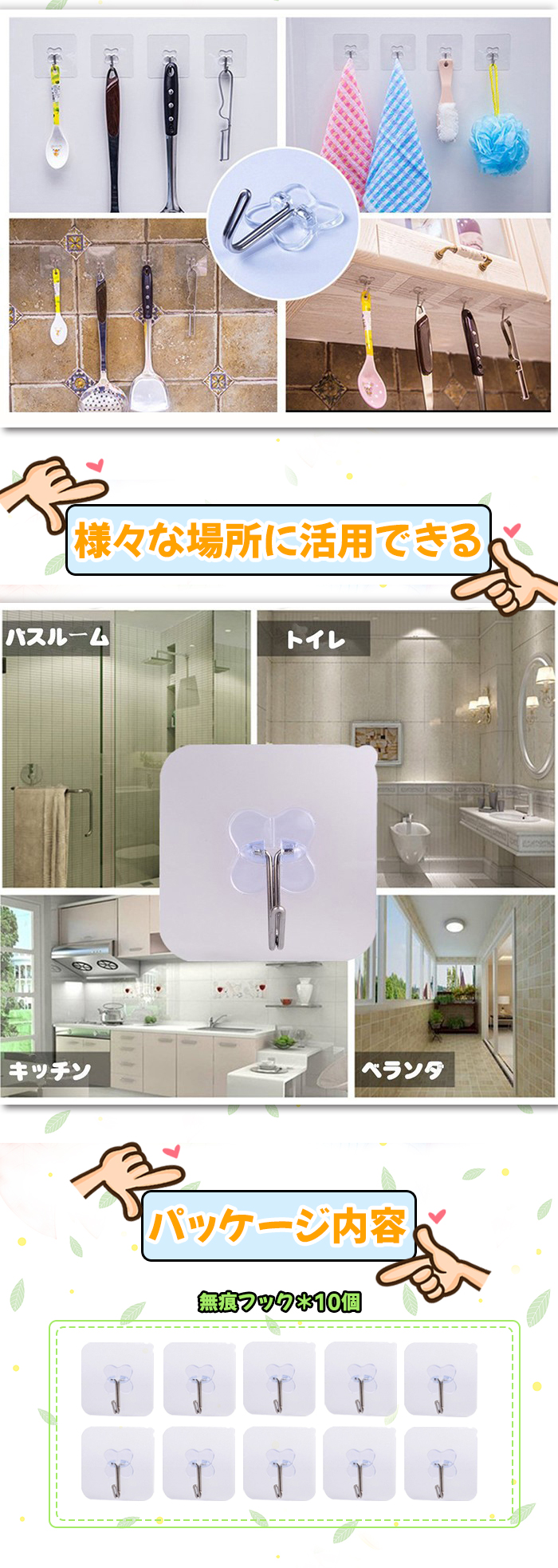 他のフックよりずっと粘り強くて長持ちします。釘のようにしっかりと壁に接着して落ちにくいです。粘着フックは釘やピンを使わないため、壁を傷つけず、穴をあけない、キズ跡なくスペースを有効活用できます。効率よく収納できて毎日の家事が楽しくなるようなお気に入りの粘着フックが手に入りますように♪